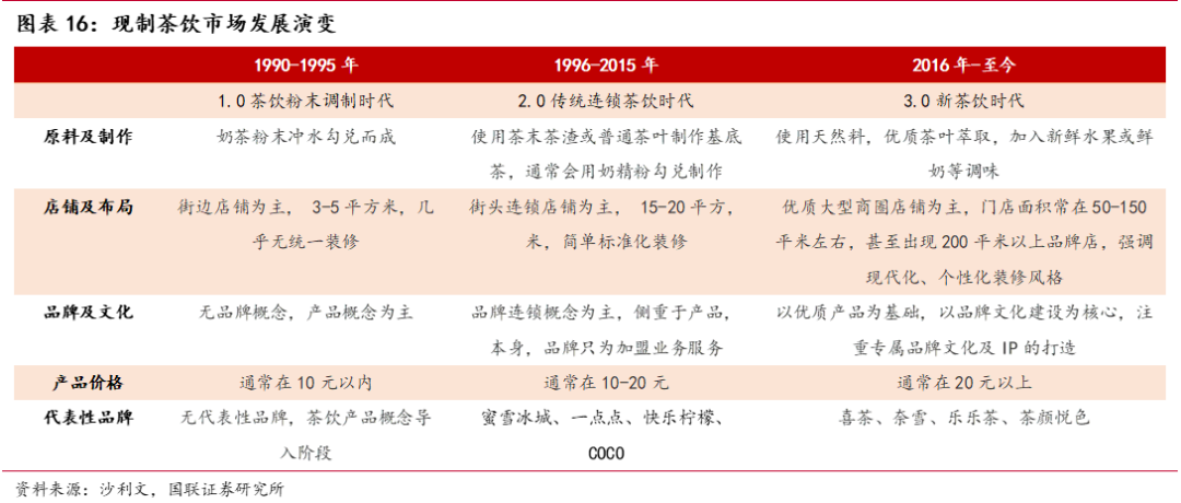 五千年古文化积淀和现代饮茶文化的结合,随着中国经济不断发展,使得中国茶饮有着立足中国、走向世界的能力。我国奶茶行业共经历三个阶段:(1)1990-1995年——茶饮粉末调制时代,原料成本低廉因此产品价格通常在10元以内。(2)1996-2015年——传统连锁茶饮时代,原材料与店铺环境均有所升级,产品价格区间提升至10-20元。(3)2016年至今——新茶饮时代,以茶为基底,加入鲜奶或鲜果等天然原材料调配成新式茶饮,打造专属品牌文化与IP。