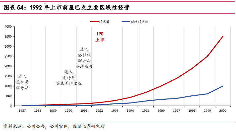 第一阶段——区域性扩张(1971年-1992年):1982年霍华德·舒尔茨加入星巴克担任营销总监,他曾向创始人建议门店引入现做咖啡但遭遇碰壁,于是在1985年选择离职创办自己的连锁咖啡店II Giornale。1987年管理层决定出售星巴克在西雅图的零售部门,舒尔茨正式借此良机收购了星巴克,并要求门店提供现做浓缩咖啡。随后,在舒尔茨的管理下星巴克迅速开始向全美各地扩张,并于1992年6月以每股17美元的价格于纳斯达克上市,上市前门店总数达到165家,仅覆盖美国和加拿大八个城市,分别是西雅图、芝加哥、温哥华、英属哥伦比亚、波特兰、洛杉矶、旧金山、圣地亚哥。
