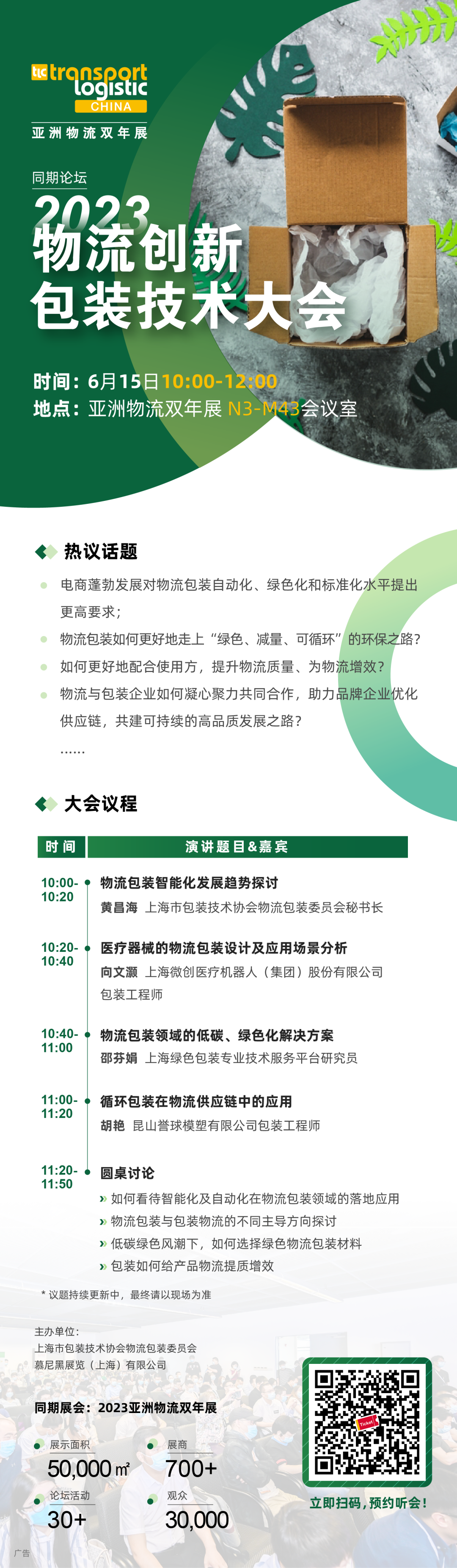 亚洲物流双年展依托多年来深耕海陆空物流服务、快递、仓储、电商、生鲜、预制菜以及生产制造业所积累的强大展商与观众资源,再度联合上海市包装技术协会物流包装委员会,于6月15日展会期间,共同主办“物流创新包装技术大会”,协力推动供需高效对接。论坛将聚焦物流包装的创新应用,助力物流供应链绿色高效发展,探讨绿色低碳风潮下物流包装行业未来之路。