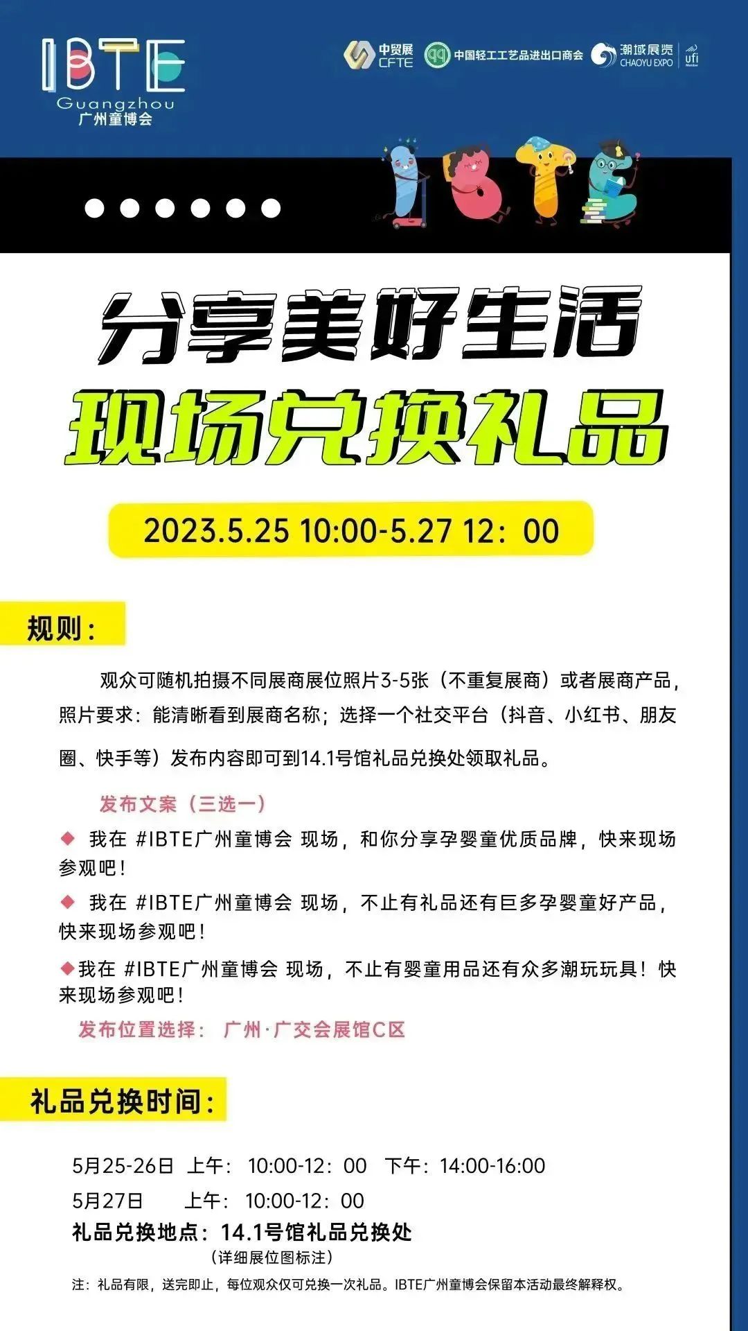 2023年5月25日,由中国对外贸易广州展览有限公司、中国轻工工艺品进出口商会与广东潮域展览有限公司联合主办的IBTE广州国际孕婴童产品博览会(简称:IBTE广州童博会)在广州·广交会展馆C区开幕!本届展会为期三天,汇集来自国内外近300家企业参展。