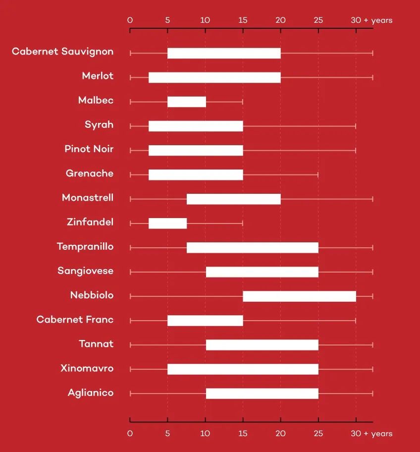 经典的陈年酒,像是高质量的波尔多混酿、长时间橡木桶熟成的意大利 Nebbiolo、Sangiovese、德国优质产区的 Riesling、高含糖量的贵腐酒等等。这些酒无一例外都具有相同的特质,浓缩度高、结构扎实,经得起时间的洗练。陈年过程中,风味物质会分解转化,果味、单宁和酸度都会下降,同时三级风味会提升。理想的陈年结果是一二三级风味相互融合,酒体仍然保持良好的平衡。单宁、酸度、风味之间没有过低或过高这种突兀的存在。但要达成这样的效果,一瓶酒的底子必须相当过硬才行。