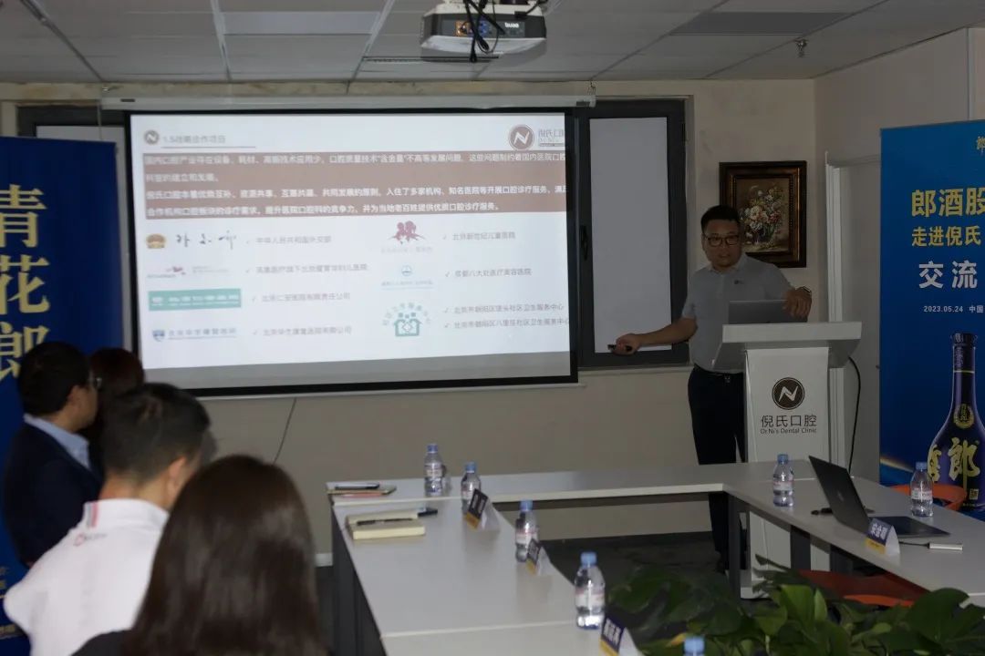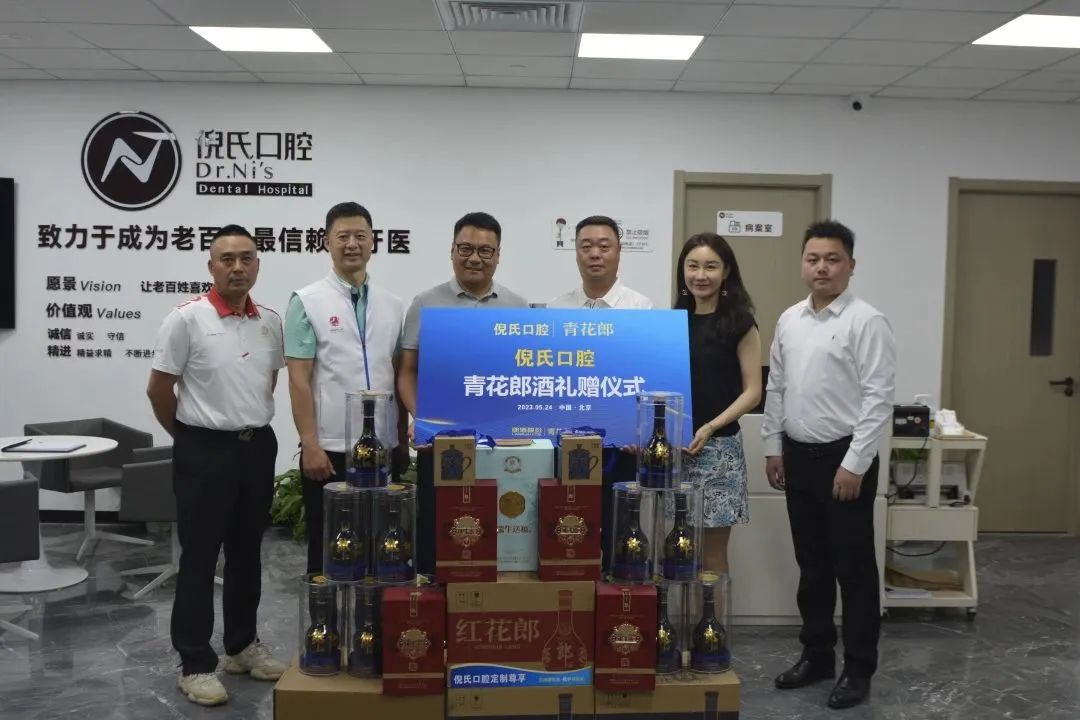 2023年5月24日上午,郎酒股份行政办主任张旭先生、北京松叶商贸有限公司总经理雷贤英先生、郎酒青花郎事业部京津唐办事处城市经理宋金聪先生、中欧华北高协会长聂廷再先生、中欧华北高协品牌活动部海霞女士一行莅临倪氏口腔(金台路院)交流走访。