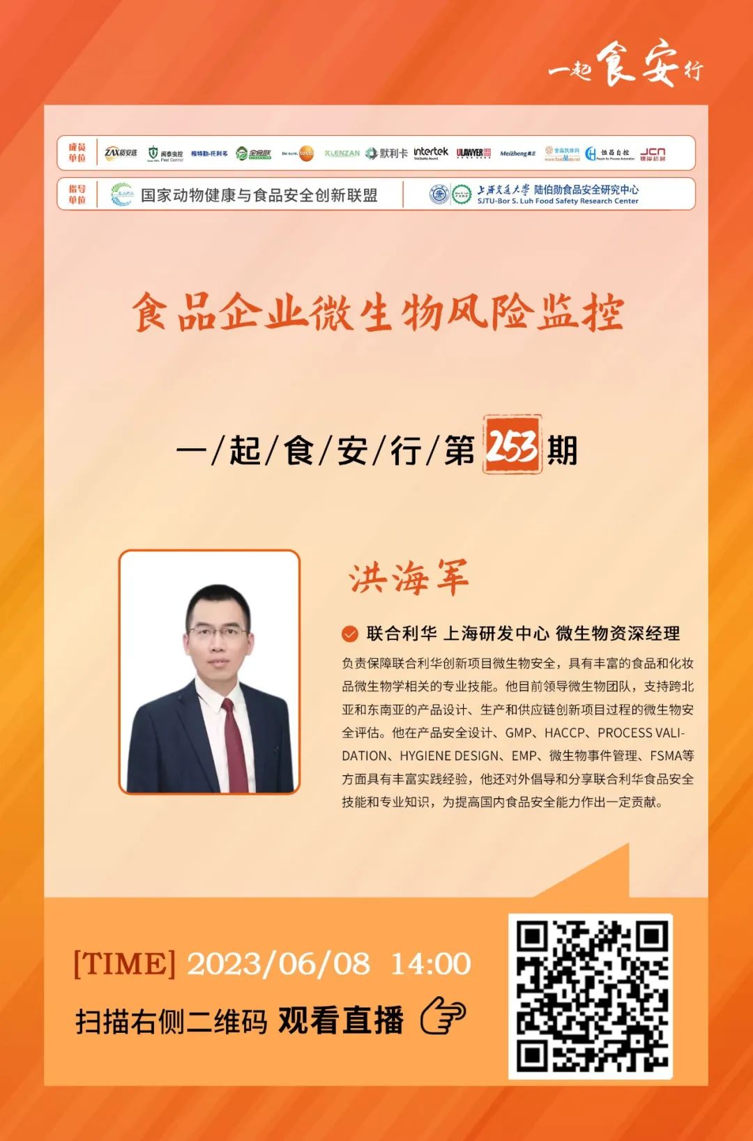 6月8日14:00-15:00,“一起食安行”公益直播课堂将会举办第253期,本期特邀联合利华 上海研发中心 微生物资深经理——洪海军,为大家带来关于《食品企业微生物风险监控》主题分享,扫描海报二维码即可预约观看: