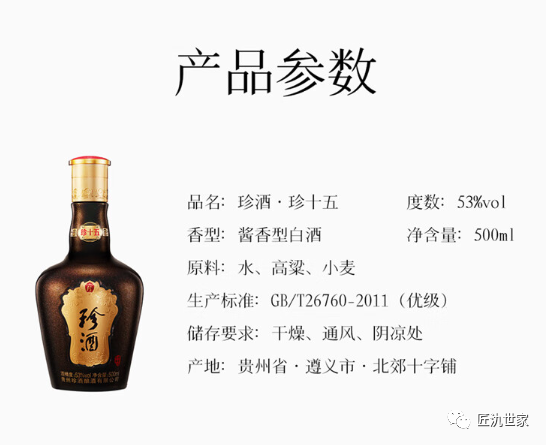 珍酒珍十五 是贵州茅台镇生产酿造的一款酱香型白酒,传统的酱香酒生产工艺是12987生产工艺。就是一年一个生产周期,两次投粮、九次蒸煮、八次发酵、七次取酒