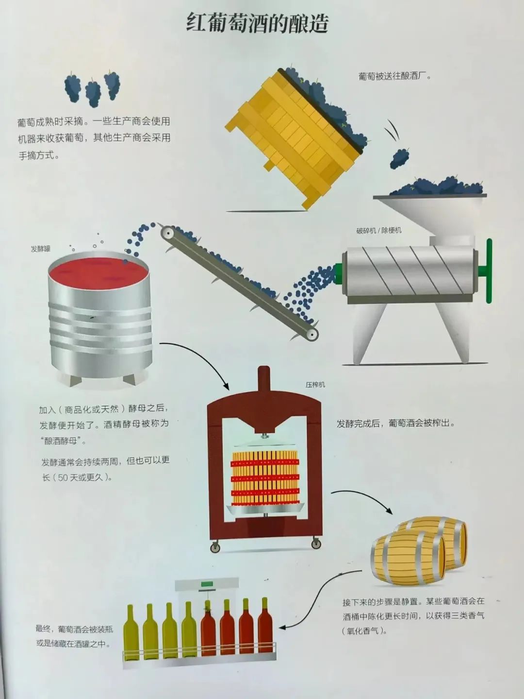 红葡萄酒在酿造时,酿酒师会把压榨后的葡萄连皮带籽都扔进发酵罐,发酵过程中,果肉、果皮、种子、果梗通通都混在一起,其中的单宁也是浸渍出来,酒液中的单宁含量自然就多了。