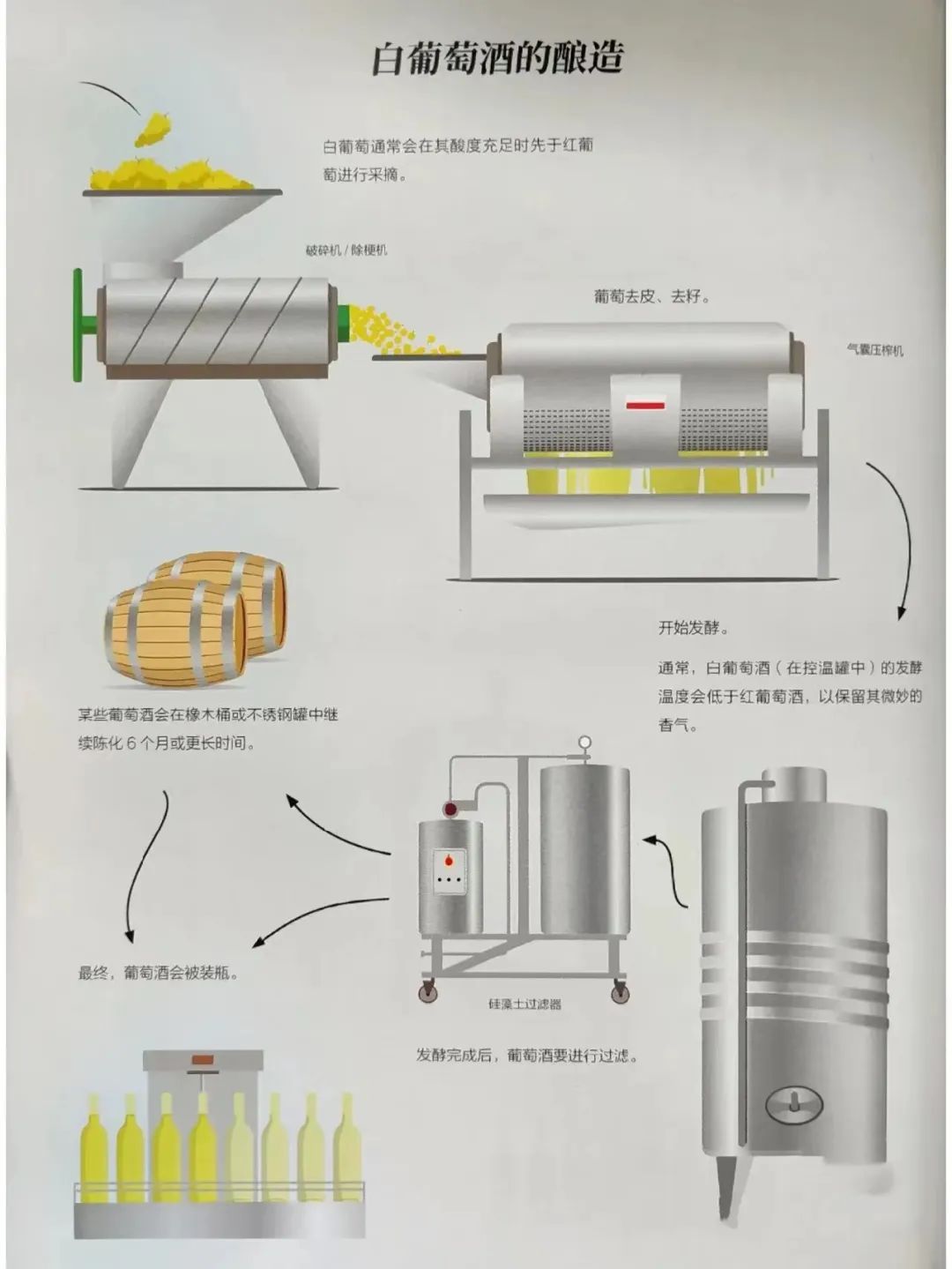 白葡萄酒就比较 “ 小清新 ”了,在酿造时,用压榨出的白葡萄汁进行发酵,减少与果皮的接触,单宁含量就少了很多。