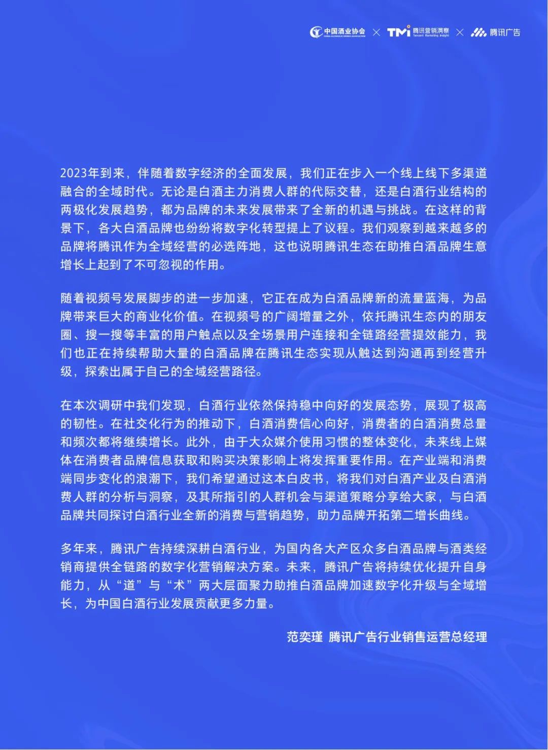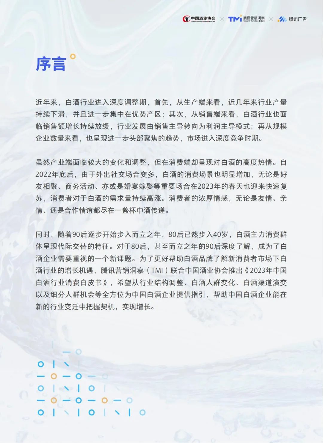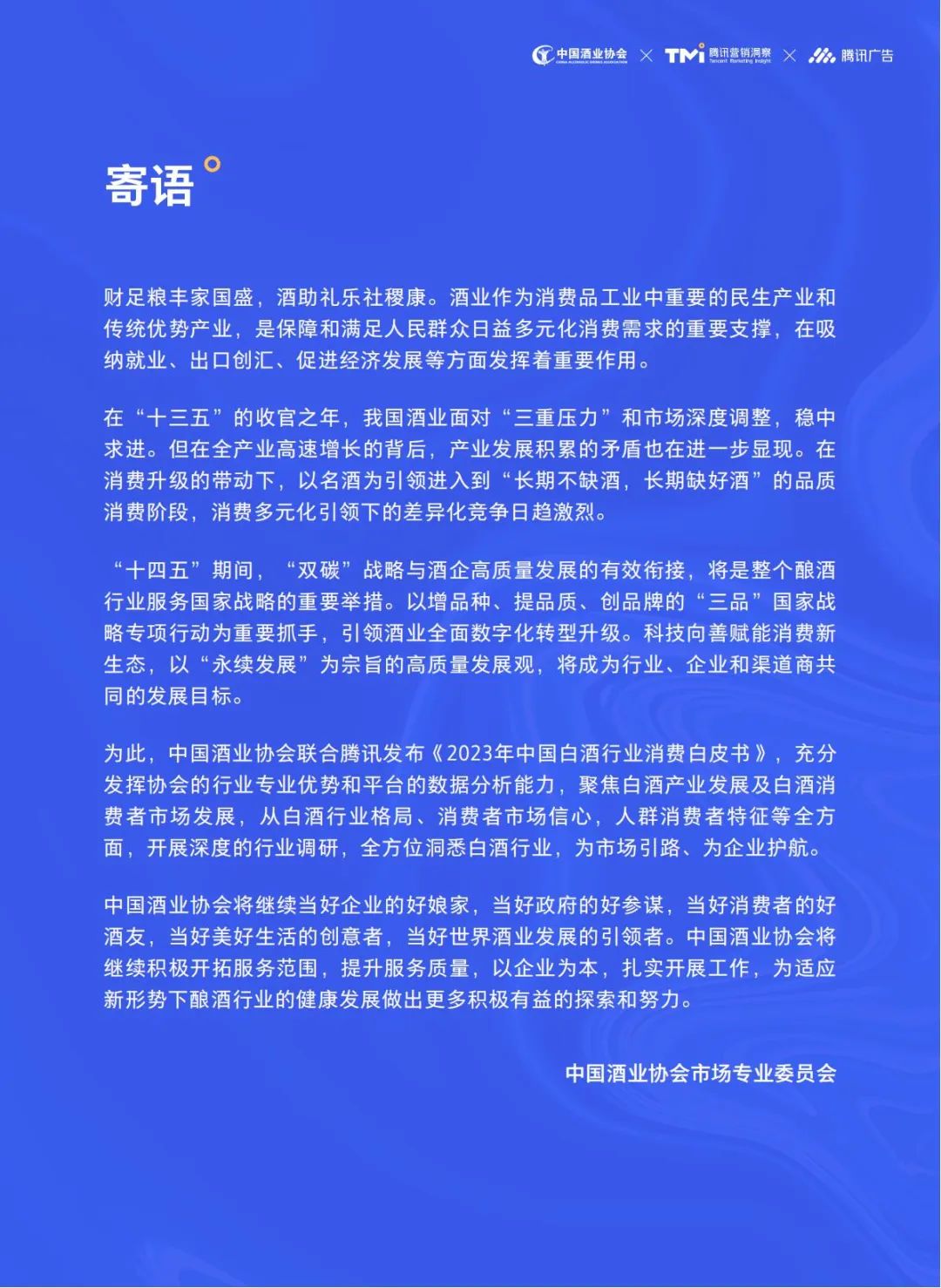 为此,中国酒业协会联合腾讯发布《2023年中国白酒行业消费白皮书》,充分发挥协会的行业专业优势和平台的数据分析能力,聚焦白酒产业发展及白酒消费者市场发展,从白酒行业格局、消费者市场信心,人群消费者特征等全方面,开展深度的行业调研,全方位洞悉白酒行业,为市场引路、为企业护航。
