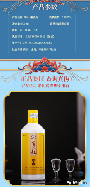 厚礼·相待酒甄选本地优质高粱、小麦、赤水河河水等作为原料,严格秉承传统“12987”酿造工艺,赋予酒体“酱香突出、幽雅细腻、口感醇厚、空杯留香持久”的风格。
