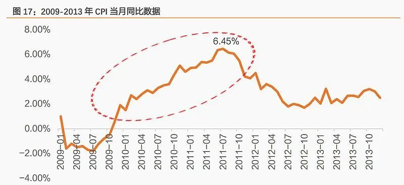 为了对冲金融危机导致的出口下滑,中央在2009年推出了四万亿的刺激计划,加上地方政府通过城投扩张出来的数万亿资金,整个经济再次进入火热状态。和04-08年类似,此时中高端的白酒消费还是以政商场景为主,基建、地产和厂房的投资都在大干快上,这对中高端白酒需求量的快速增长提供了有力支撑。宏观环境的火热推动了物价上涨,高通胀给酒企提供了良好的提价机会。2009年2月,CPI同比-1.60%,然后一路向上,2011年7月,CPI同比6.45%,