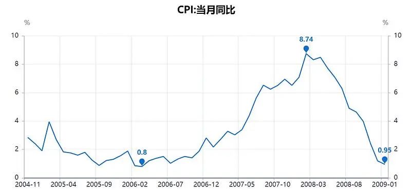 2008年金融危机的到来给经济泼了一盆冷水,CPI从8.74%的高点跳水式下跌到0.95%。