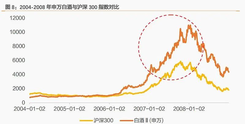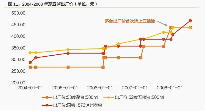 在这一轮的涨价周期中,茅台率先开始搞团购业务,为主要群体(官员和大商)定制茅台酒,培养了一大批拥趸,为日后最高端白酒的形象打下了坚实的基础,这是茅台发展历程中非常重要的一步。2008年初,茅台的出厂价开始接近五粮液,品牌力进一步提升,五粮液在这个过程中被茅台逐渐甩开。