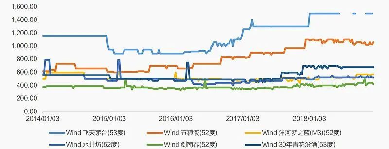 之前积累的渠道库存消化干净后,茅台的批发价于2016年下半年开始不断上行,打开了其他白酒的上涨空间。如下图所示,酒企又开启了一轮涨价。这一轮中头部酒企的大单品定价逐渐往上走,整个白酒行业再此步入上行周期,利润和股价都是大涨,这也是大多数人第一次买入白酒的时间点。