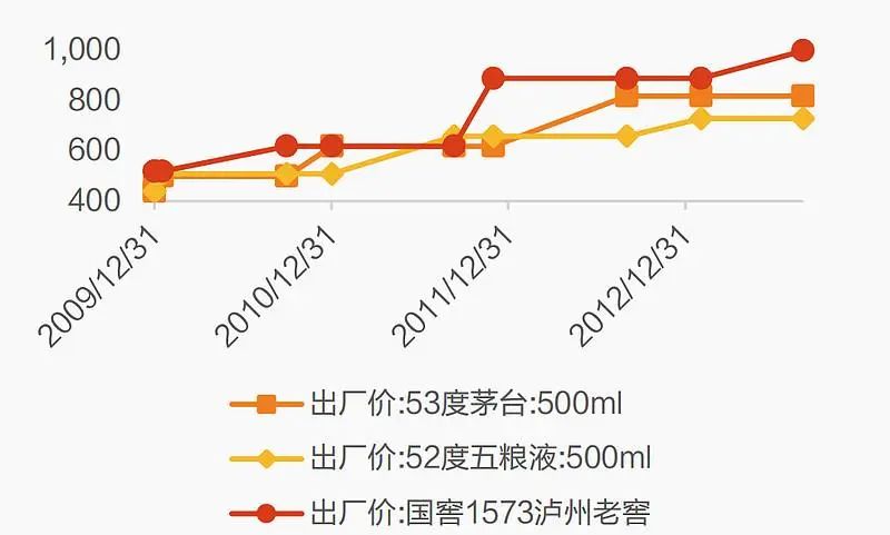 2009-2013 年期间,茅五泸三家酒企纷纷提价 3 次,其中茅台出厂价由 2009 年 438元提升至 2012 年 819 元,一跃超过五粮液,从此成为当之无愧的行业标杆。