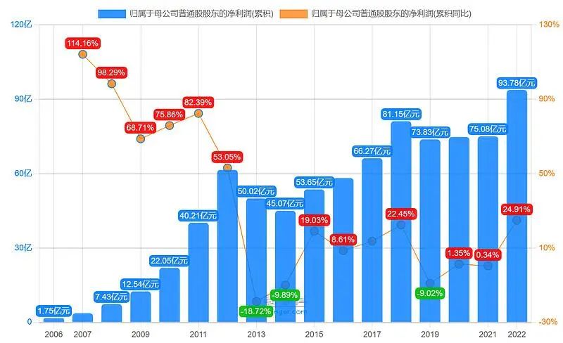 举个例子,洋河就是在这个过程中异军突起的,通过自建的营销团队,疯狂铺货,实现了利润的飞速增长。下图是洋河的利润增速图,从08年到12年,洋河是名副其实的成长股,平均下来的净利润增速高达70%以上。当然这种品牌力不强,依靠销售强推的做法也为洋河未来的渠道问题埋下了伏笔,此后的十余年中,洋河的利润和股价涨幅都是中高端白酒中最差的。