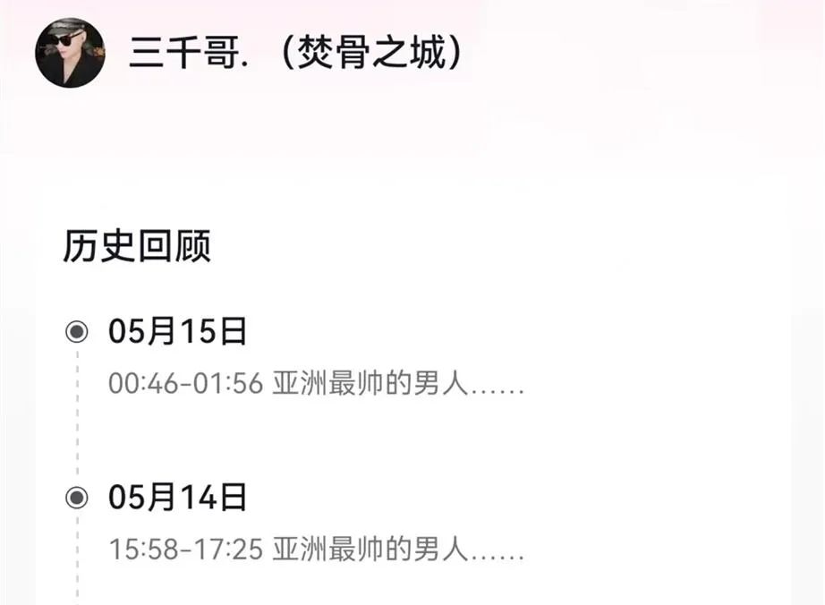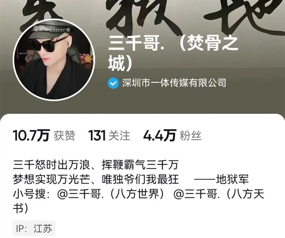 三千哥的小号还能正常查看,从三千哥小号的个人简介不难看出,三千哥不仅酒量好,为人还特别霸气豪爽,他在简介中写道:“三千怒时出万浪,挥鞭霸气三千万,梦想实现万光芒,唯独爷们我最狂”,三千哥的小号开播记录最后一场是5月15日。