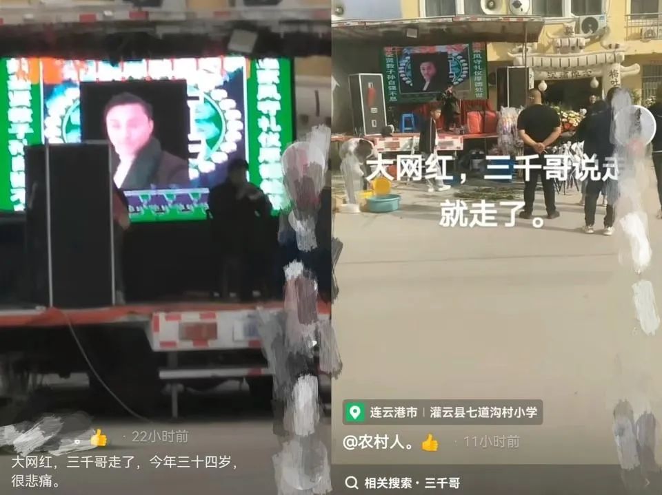 三千哥的邻居曝光了三千哥的葬礼现场视频,视频中有可以看到,三千哥的遗像挂在舞台中央,舞台上还有人吹着哀乐,年纪轻轻就这么走了,邻居透露三千哥已经结婚有孩子了,他的突然离世,妻子和孩子的日子以后就难过了。