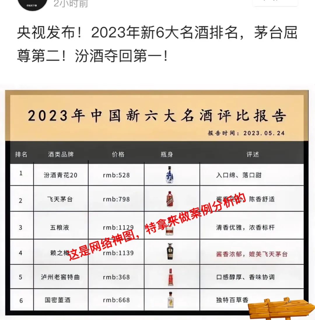 图片前还配了文字,说这是“央视发布!2023年新6大名酒排名,茅台屈尊第二!汾酒夺回第一!”现在骗子都这么嚣张了吗?打着央视的名义招摇撞骗,这绝对属于犯法行为了。