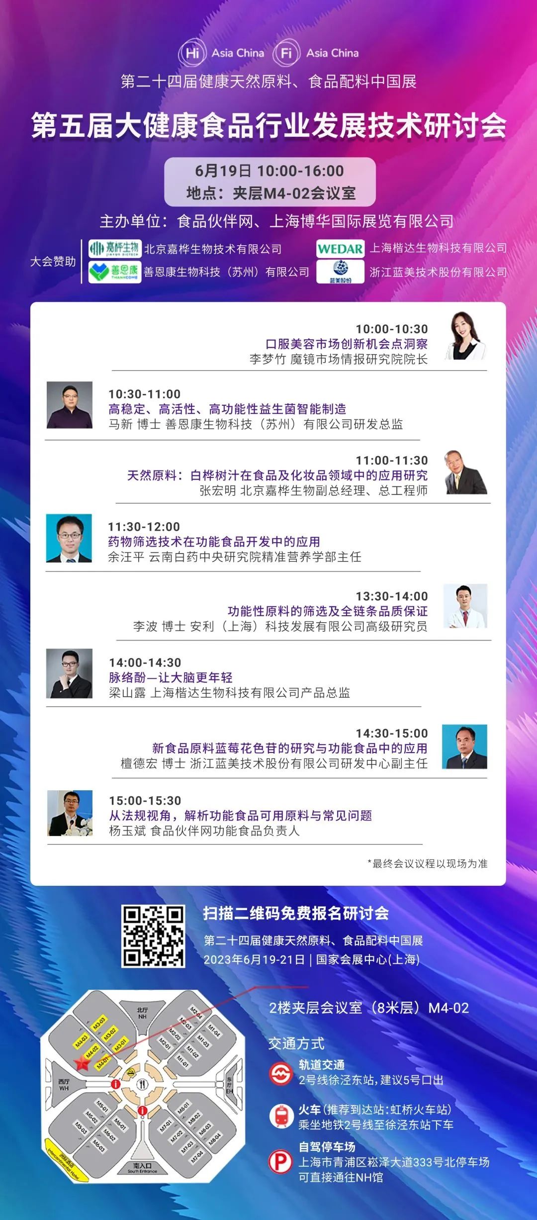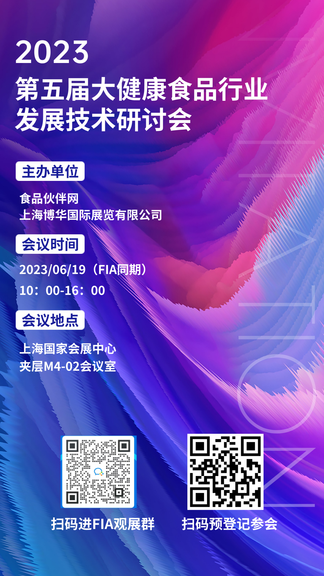 在此背景下,食品伙伴网将在2023年6月19日举办的“第二十四届健康天然原料、食品配料中国展”中举办《2023大健康食品行业发展技术研讨会》,主要针对大健康食品行业发展以及功能食品创新做相关技术讲解和分享,本次会议聚焦功能“星”原料,主要围绕功能食品明星原料、明星技术、明星应用展开讨论。