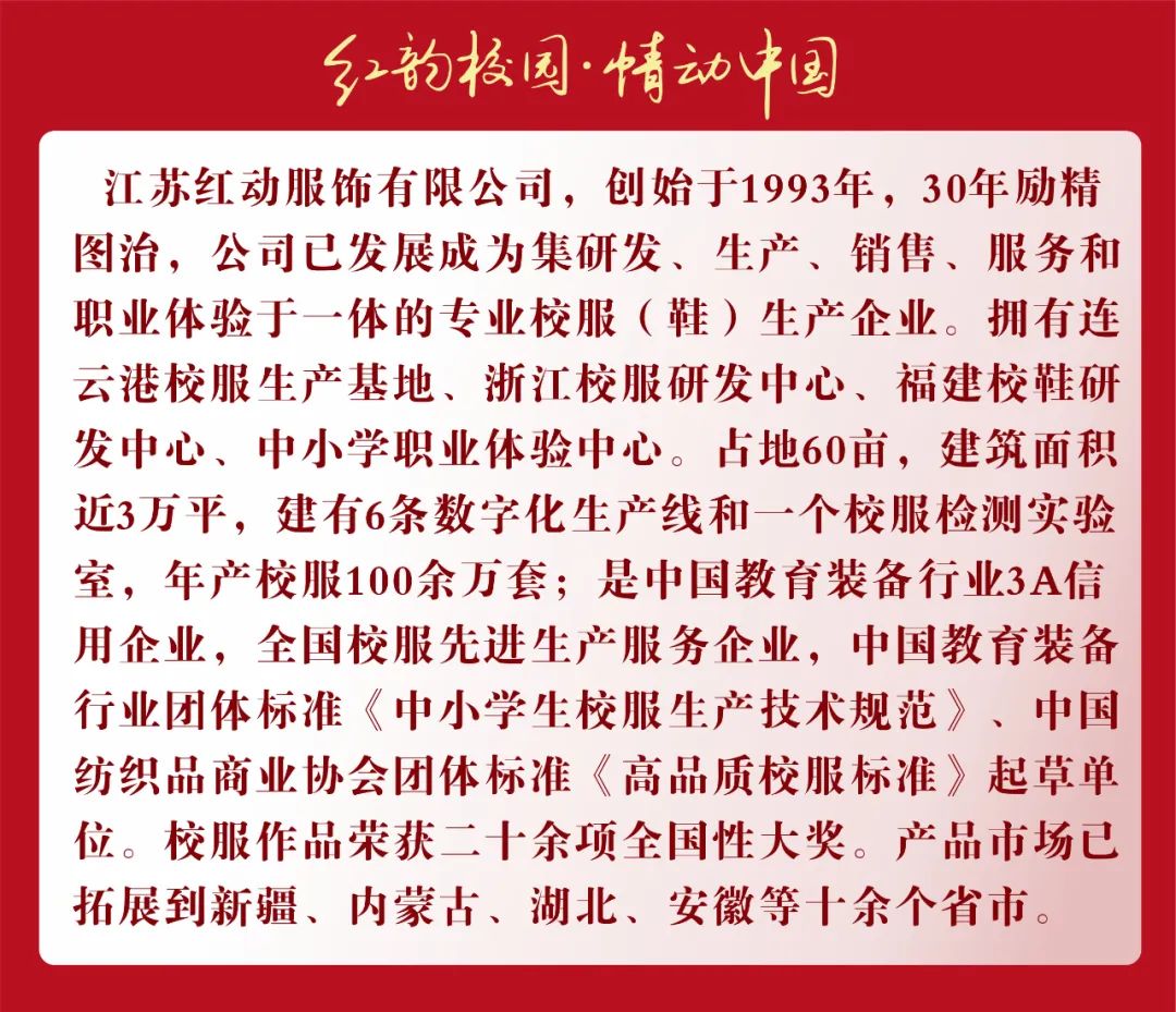 在本届教装展上,红动服饰携“红韵校园 情动中国”国风系列校服作品亮相,将中国风元素和育人理念融入产品设计,匠心演绎校服魅力,诠释中华文化底蕴与创新。