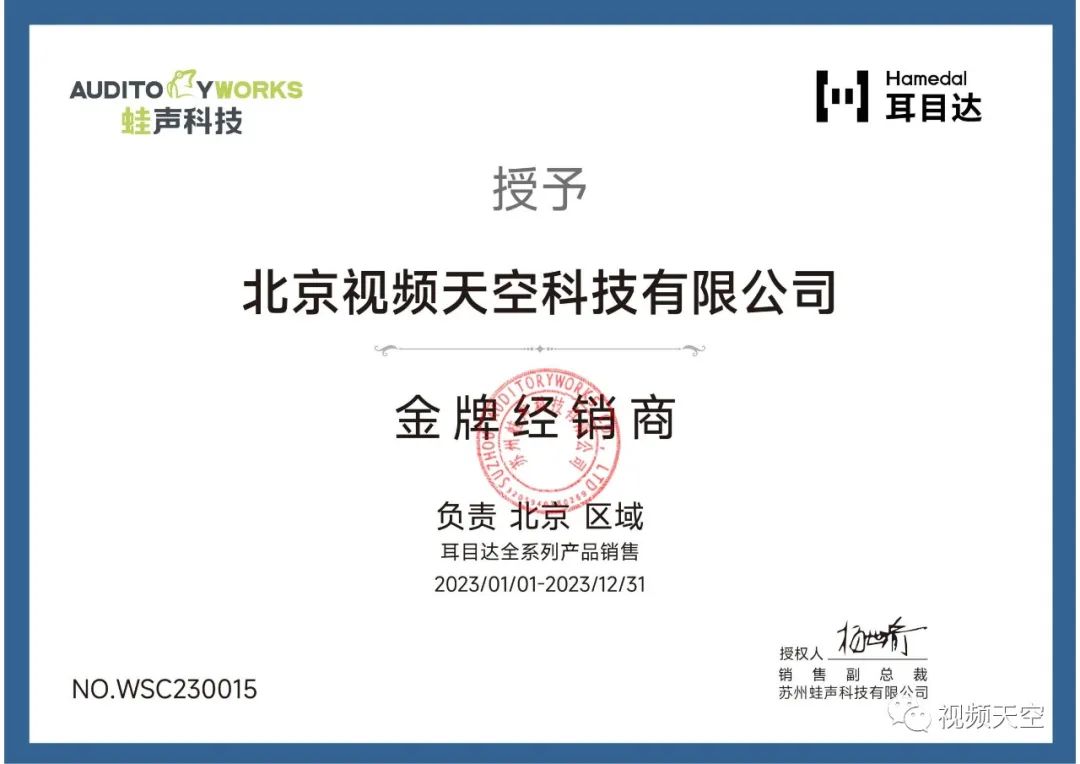 北京视频天空科技有限公司为蛙声科技2023年度金牌经销商,负责北京区域耳目达全系列产品销售。