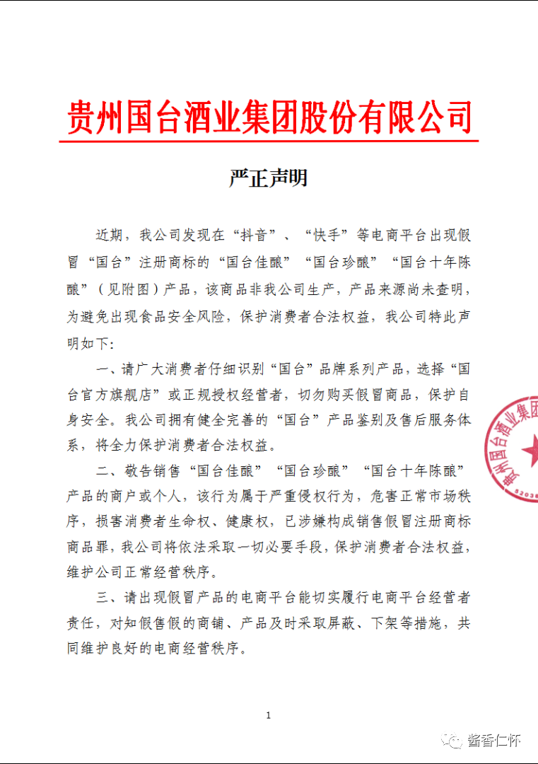 5月26日,国台酒业发布声明,针对近期发现在“抖音”、“快手”等电商平台出现“国台佳酿”、“国台珍酿”、“国台十年陈酿”等假冒“国台”注册商标的情况进行说明。声明提醒,广大消费者要仔细识别“国台”品牌系列产品,选择“国台官方旗舰店”或正规授权经营者,切勿购买假冒商品,保护自身安全。同时,敬告销售“国台佳酿”、“国台珍酿”、“国台十年陈酿”产品的商户或个人,该行为属于严重侵权行为,国台酒业将依法采取一切必要手段,保护消费者合法权益,维护公司正常经营秩序。此外,声明还提醒出现假冒产品的电商平台,要切实履行电商平台经营者责任,对知假售假的商铺、产品及时采取屏蔽、下架等措施,共同维护良好的电商经营秩序。“酱香仁怀”微信公号由仁怀市酒文化研究会主办,是受权推送仁怀白酒标准、重要信息、深度解读产区政策文章的新媒体平台。