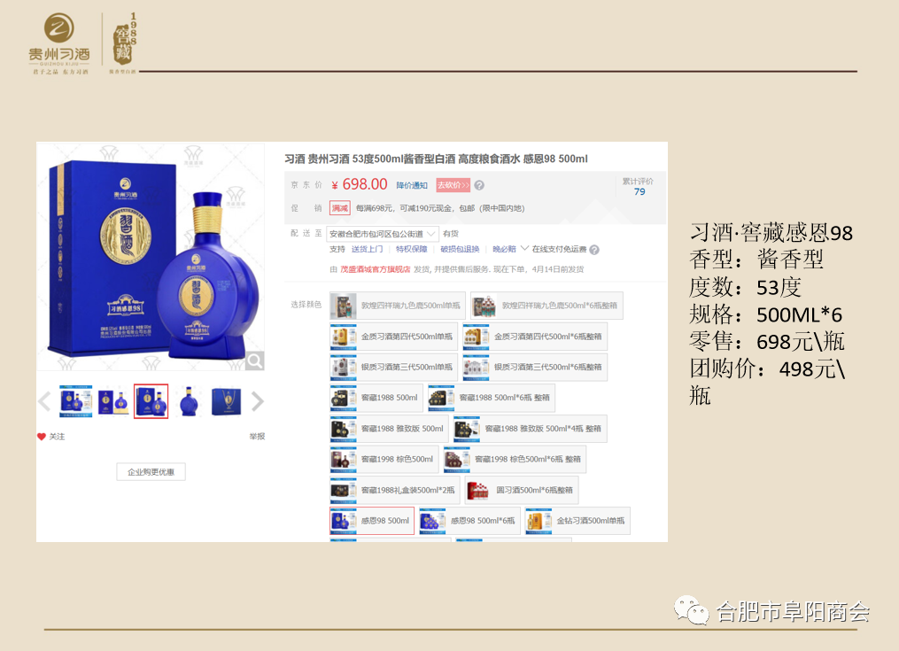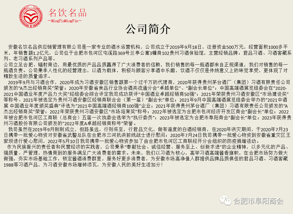 合肥市阜阳商会副会长单位:安徽名饮名品供应链管理有限公司是一家专业的酒水运营机构,公司成立于2019年9月18日,注册资金500万元,经营面积1000多平米,年销售额1.2亿元,公司位于合肥市包河区屯溪路369号兰亭公寓3幢商102贵州习酒体验馆,主营经销品牌:君品习酒、习酒窖藏系列、老习酒系列产品等。