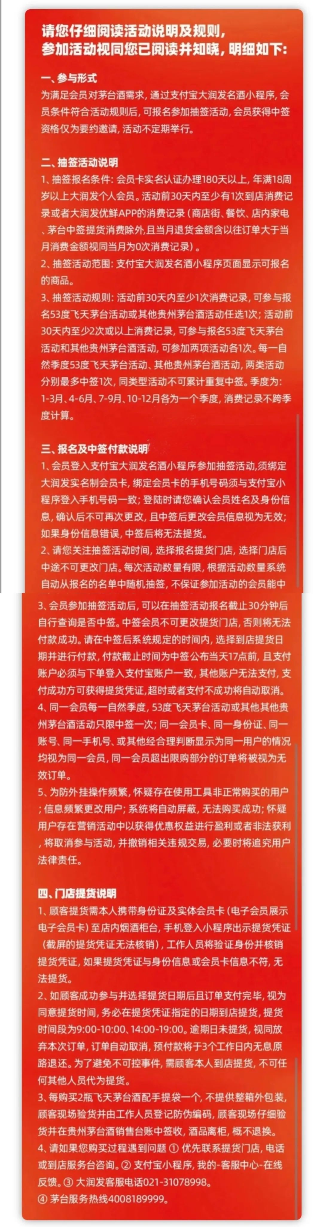 抽签报名条件,会员卡实名认证办理180天以上,年满18周岁以上,大润发个人会员活动前30天内至少有一次到店消费记录或大润发优先APP的消费记录。商店机、餐饮店内家电、茅台中签提货消费除外,且当月退货金额含以往订单大于当月消费金额,视同当月为零次消费记录