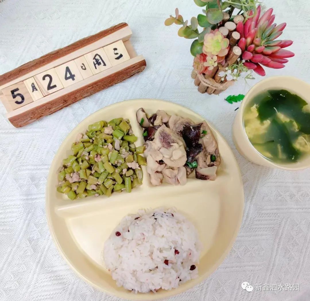 红豆米饭 香菇滑鸡 缸豆炒肉末 裙带菜豆腐蛋花汤