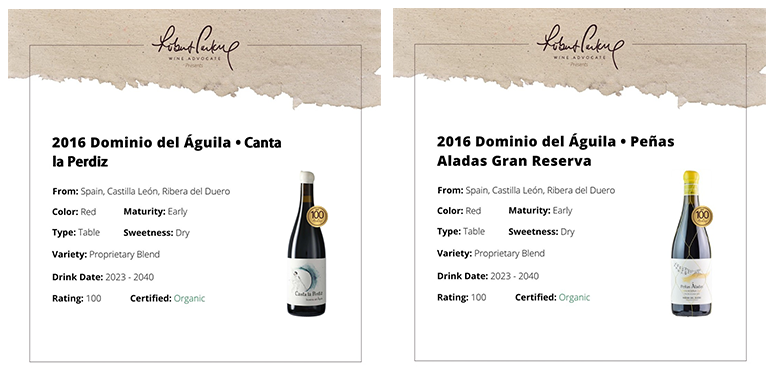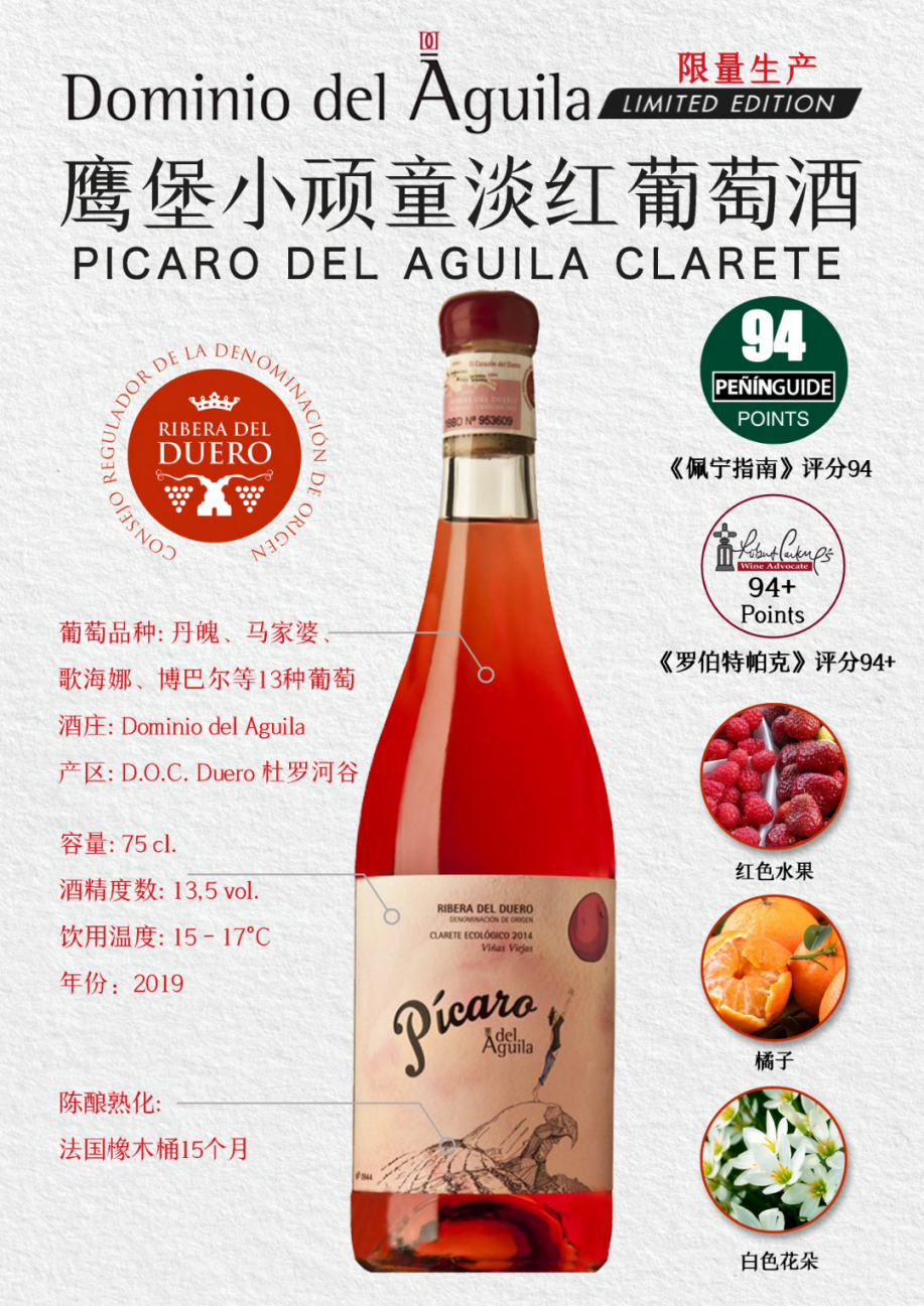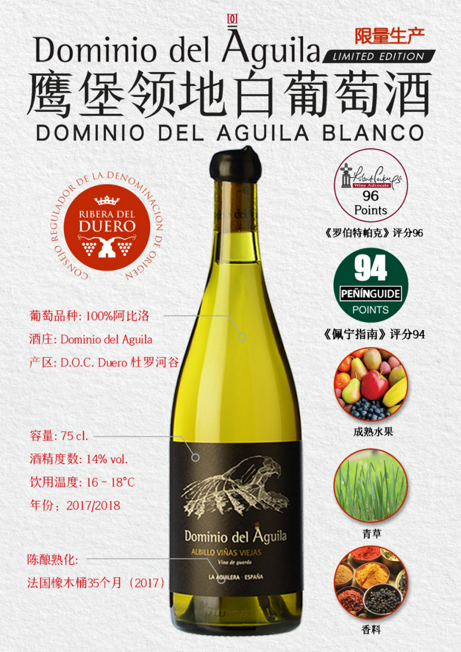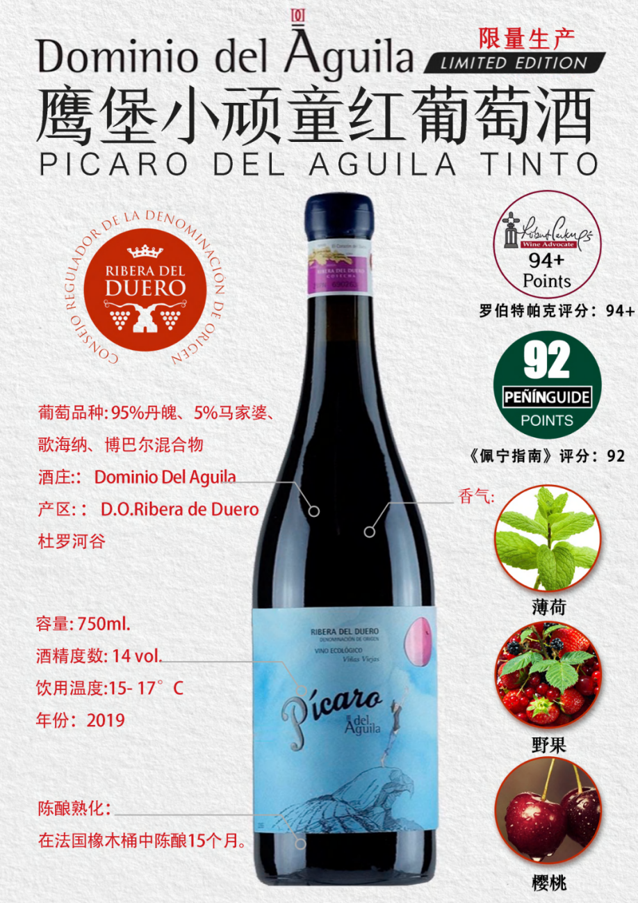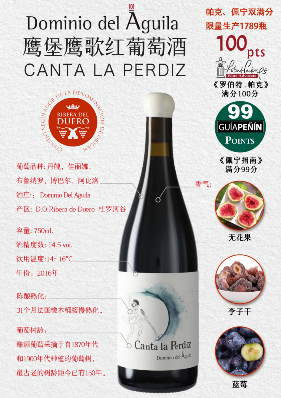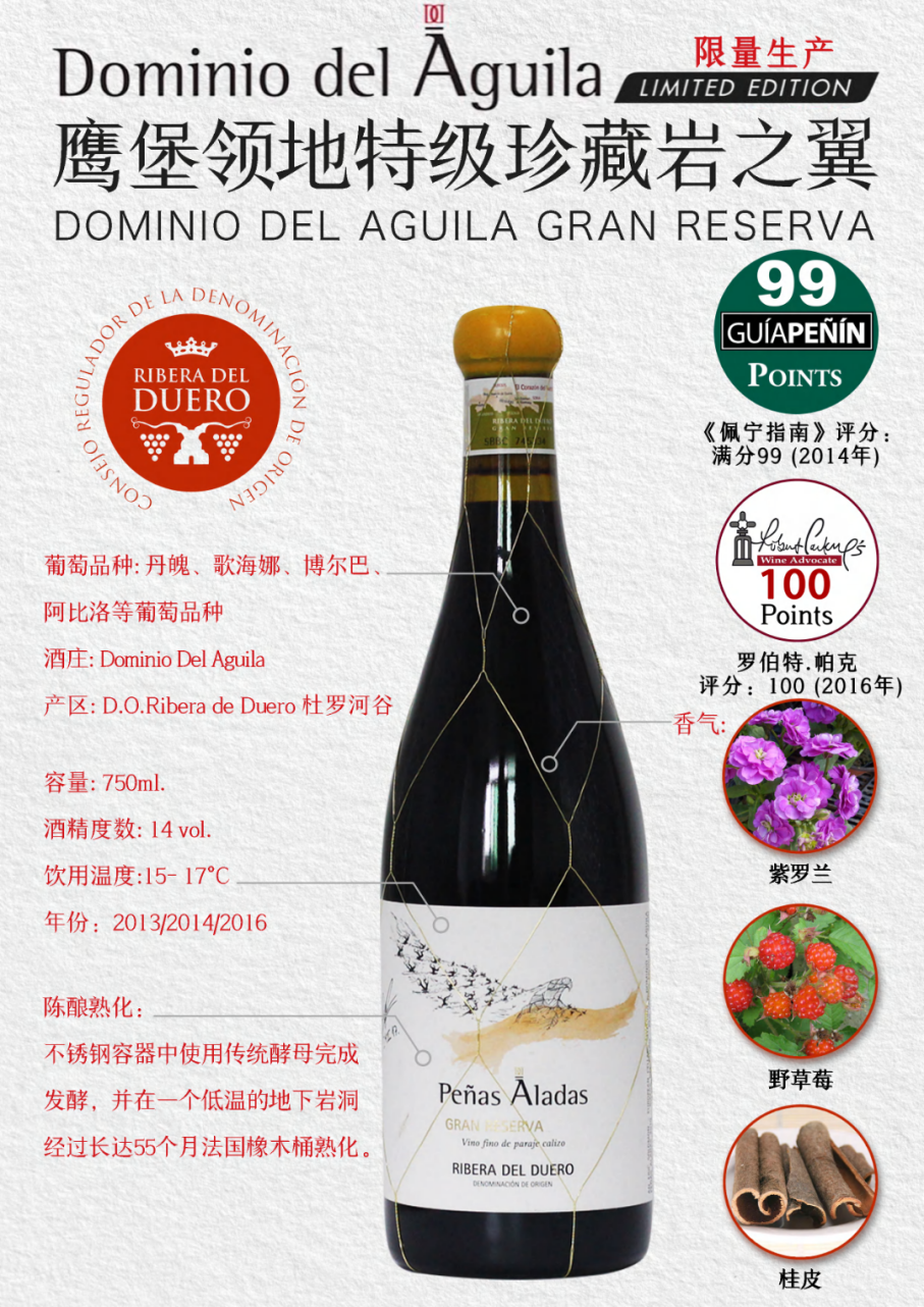 位于 LA AGUILERA 村落古老的葡萄园 Penas Aladas,海拔高度为870米-890米, 是 Dominio del Aguila 所有葡萄园里面海拔最高的一个。葡萄园里种植的主要品种为丹魄(TEMPRANILLO),大部分树龄都超过100年,使用传统种植手段,用草药浸剂(例如缬草或蜜露)来处理葡萄藤。
