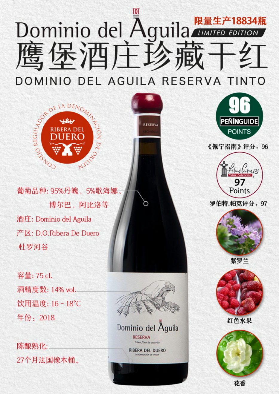 Dominio del Aguila 在2010年由 Jorge Monzon 及其妻子 Isabel Rodero 共同建立。Jorge Monzon 是当地葡萄酒世家后裔,曾在波尔多及勃艮第学习酿酒,并于罗曼尼康帝及 Vega Sicilia 酒庄工作过。这对夫妇一直坚持实行有机种植,酒庄只种植丹魄、加尔纳恰、阿比洛等原生品种,平均树龄50年以上,并用最传统的方法酿造葡萄酒,短短8年已跻身产区一流酒庄的行列。