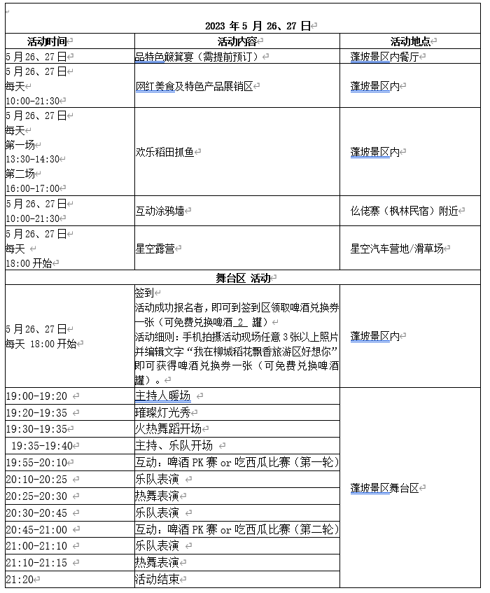 活动细则:手机拍摄活动现场任意3张以上照片并编辑文字“我在柳城稻花飘香旅游区好想你”即可获得啤酒兑换券一张(可免费兑换啤酒2罐)。