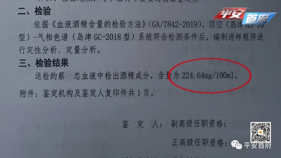 通过监控画面我们可以看到,在22点04分,驾驶员 蔡某忠刚从饭馆出来就上了自己的车,就在同一时间民警正好将锥桶摆上开始也夜查工作,没过一分钟,蔡某忠就被民警查获了,你这个位置挪的有点太巧了 。经过 抽血化验 驾驶员 蔡某忠 每百毫升血液中酒精含量为224.64毫克。本周醉驾排行第一名:啤酒喝了一小杯 数字是几看不清