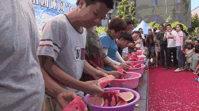 游戏分为三组进行,以现场随机挑选6名选手参赛在最短时间内吃完,西瓜皮完整无红囊者胜出,以此选出1、 2、3名。