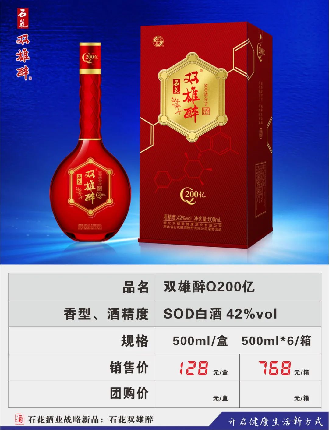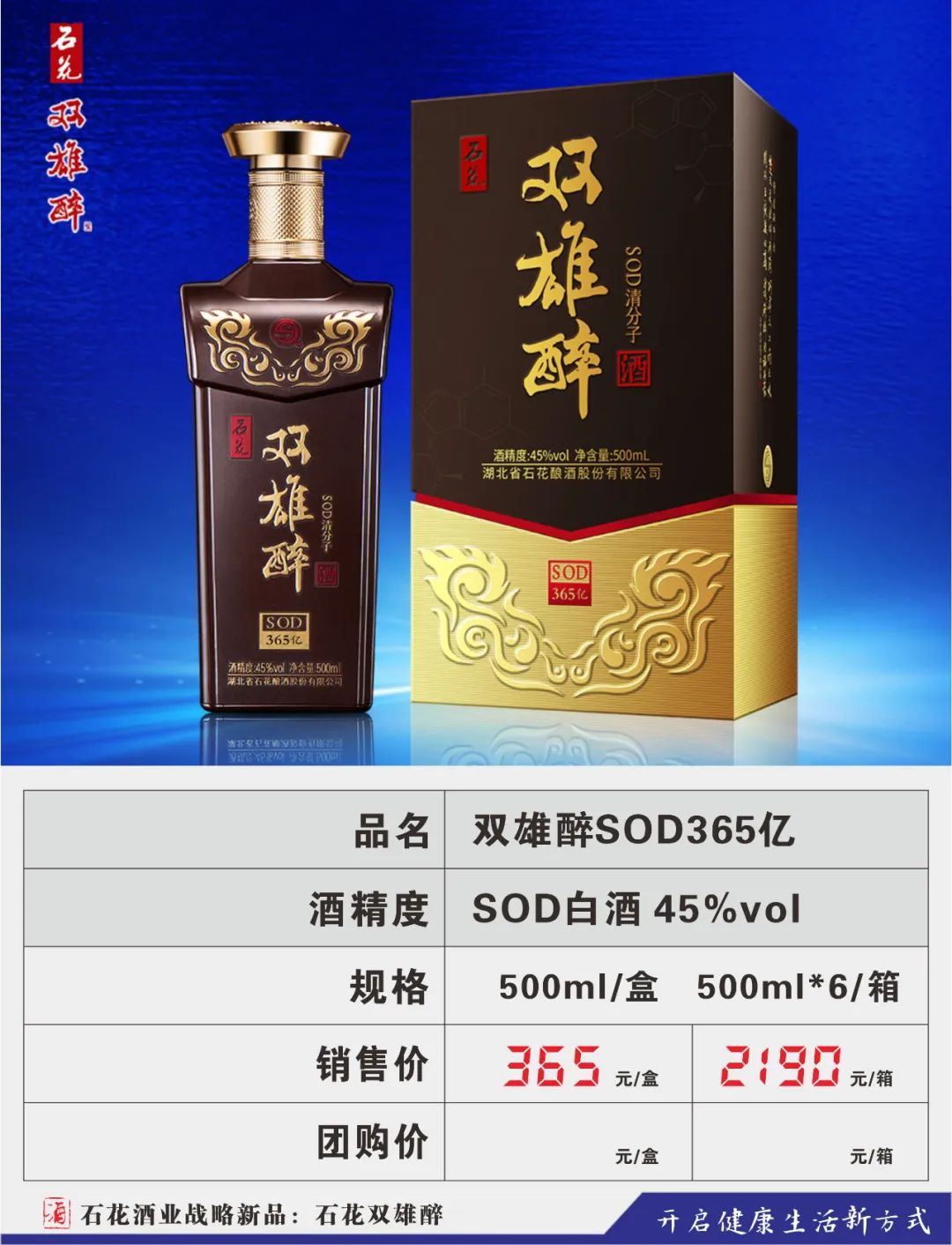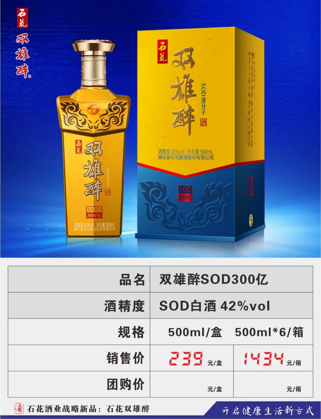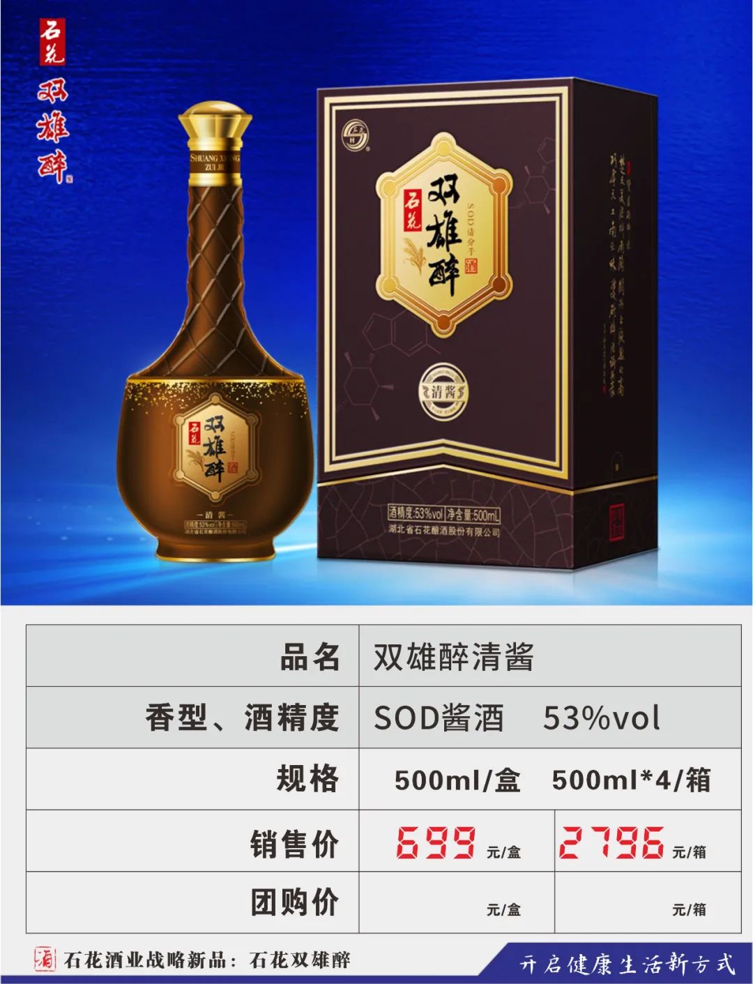 为顺应人民群众不断升级的健康需求,公司将眼光瞄向了悄然成长的健康酒市场,2016年,在汉江流域生态白酒研究院高景炎院长和专家们的指导下,由石花酒业酿酒大师龚新敏精心酿造,酿酒大师刘忠军精心调制,品酒大师卢敏反复品评,在传统地缸发酵、大曲清香工艺基础上,融合了具有专利技术的益微SOD黑小麦等多种生态原材料,历时三年,反复改良,终于打造出品质更卓越、口感更完美的双雄醉新产品,酒体中富含SOD等活性微因子。原中国酿酒工业协会白酒专家组组长梁邦昌先生:双雄醉酒是中国健康白酒的一大创新。