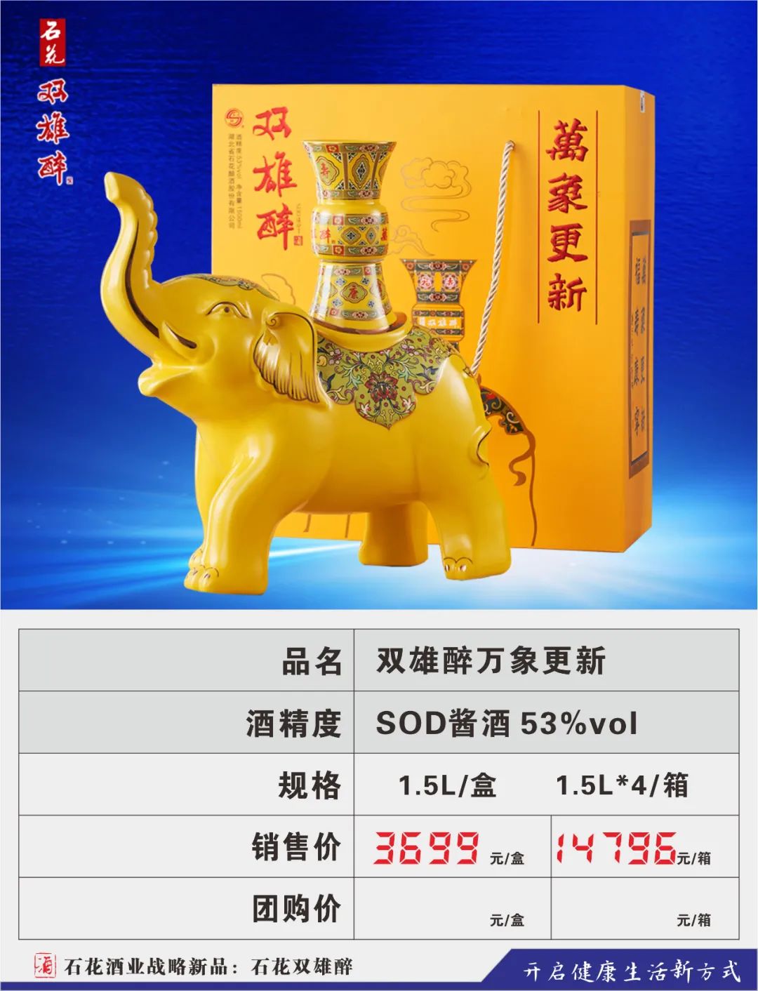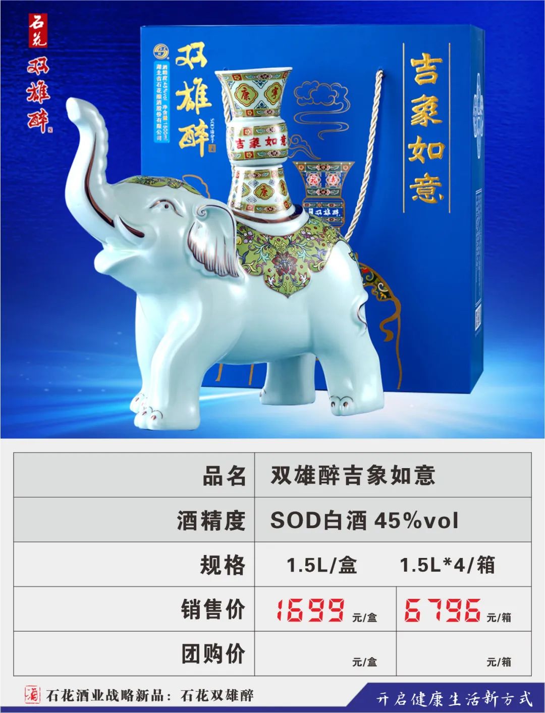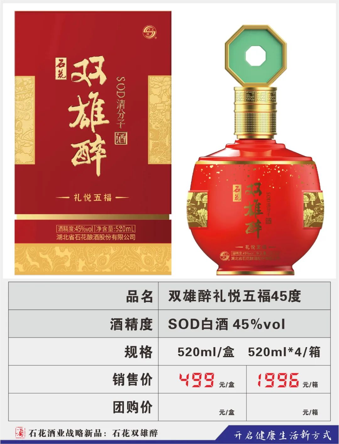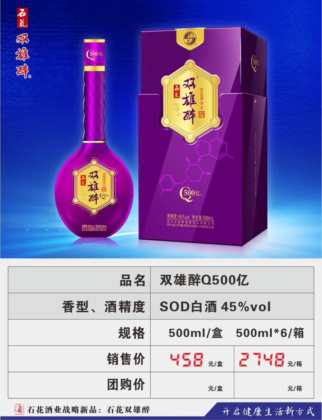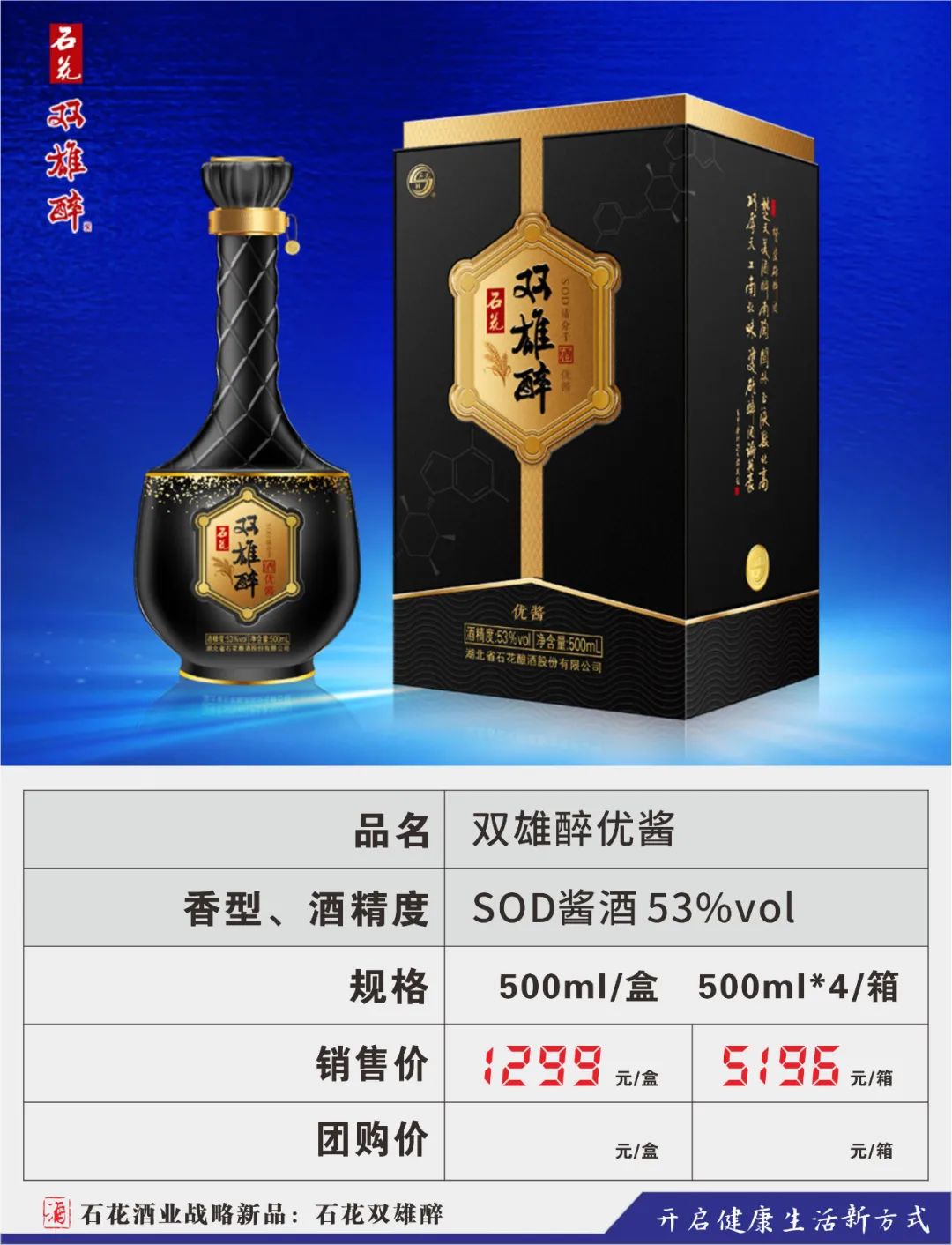 为顺应人民群众不断升级的健康需求,公司将眼光瞄向了悄然成长的健康酒市场,2016年,在汉江流域生态白酒研究院高景炎院长和专家们的指导下,由石花酒业酿酒大师龚新敏精心酿造,酿酒大师刘忠军精心调制,品酒大师卢敏反复品评,在传统地缸发酵、大曲清香工艺基础上,融合了具有专利技术的益微SOD黑小麦等多种生态原材料,历时三年,反复改良,终于打造出品质更卓越、口感更完美的双雄醉新产品,酒体中富含SOD等活性微因子。原中国酿酒工业协会白酒专家组组长梁邦昌先生:双雄醉酒是中国健康白酒的一大创新。