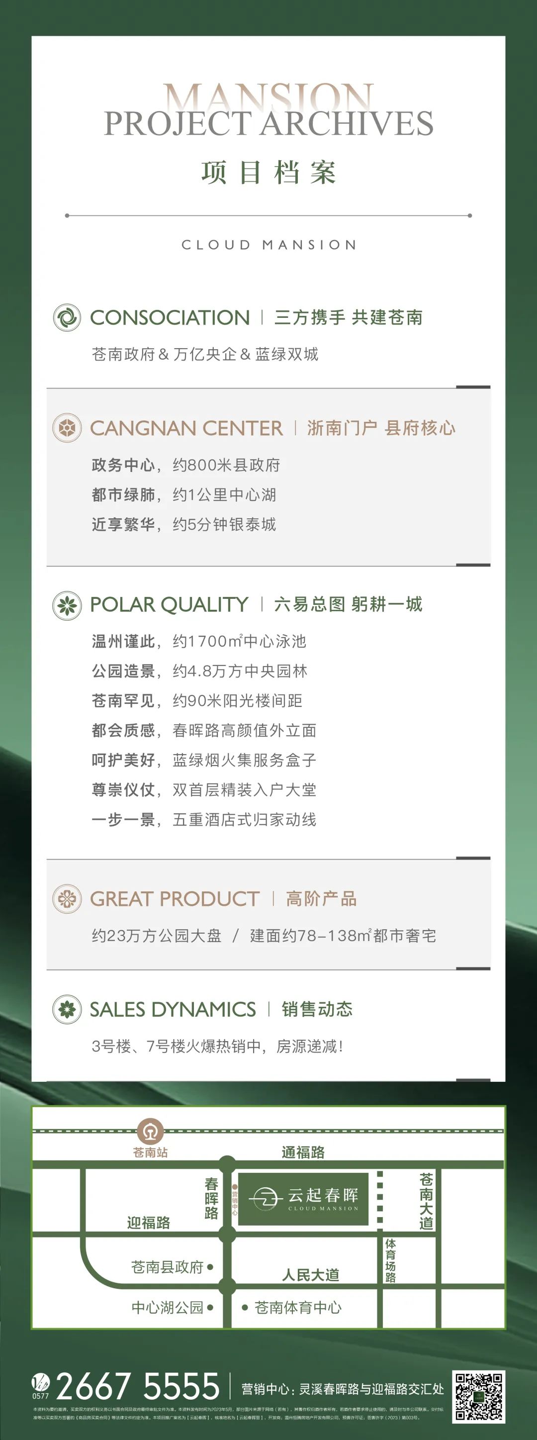 1.本项目推广名为云起春晖,备案名为云起春晖里;共建商:蓝绿双城科技集团有限公司;开发公司为温州恒腾房地产开发有限公司。2本宣传资料所涉及图片、文字、数据及其他内容仅供参考,所有内容不作为合同要约或开发商的任何诺。3.有关开发项目信息的介绍,均以政府最后审批文件为准,商品房买卖双方之间的权利义务关系均以签订的《商品房买卖合同》等法律文件约定为准。4.本资料部分素材来源于网络,其著作权归原作者所有;如果原作者表明其身份要求本公司停止使用该素材的,请与本公司联系。5.本广告发布时间为2023年5月。预售证号:苍售许字(2023)第003号