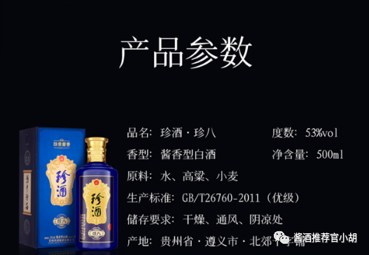 珍酒珍八是贵州珍酒酿酒有限公司精选陶坛珍藏8年以上的优质酱香老酒,协调融合,精心勾制,并经瓶装珍藏6个月以上,酒体微黄透明,幽雅细腻,入口老熟醇和,余味悠长,空杯留香,酱香风格突出。