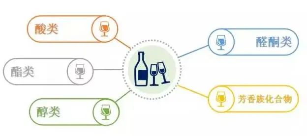 白酒的香气是指人们利用其嗅觉器官(鼻腔)对白酒进行闻嗅后吸入的一种气味成分。它是挥发性的放香物质分子在空气中扩散后,进入人的鼻腔内刺激嗅觉器官,通过神经信息的传递与整理,于是产生一种香感,即香气。而这些放香物质指的便是一些微量物质,通常,我们将它们分为这五大类: