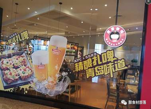 2017年,肯德基在山东省、河南省的35个地级市中的430家肯德基餐厅售卖与青岛啤酒合作的“鸿运当头”鸡年款特别包装啤酒。随后,又在青岛市6家KFC餐厅搭配美味颠覆的KFC CHIZZA,上线了两款精酿扎啤,即全麦白啤和13度高浓精酿。