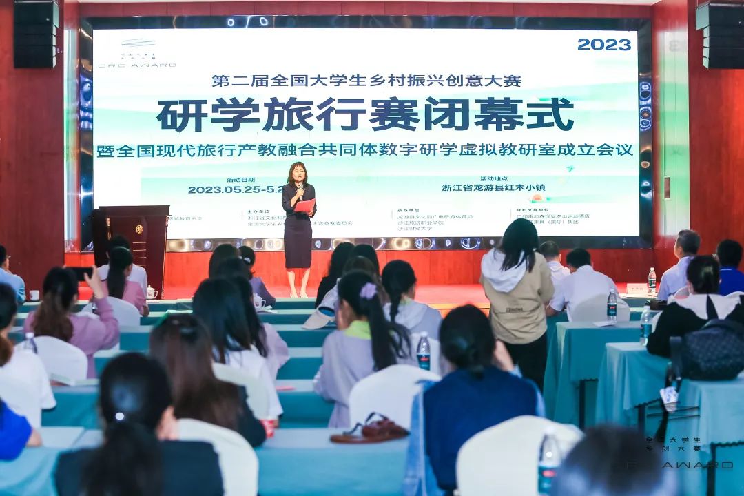 5月26日,由中国旅游协会旅游教育分会指导,浙江省文化和旅游厅、全国大学生乡村振兴创意大赛竞赛委员会主办,龙游县文化和广电旅游体育局、浙江旅游职业学院和浙江财经大学共同承办的第二届全国大学生乡村振兴创意大赛研学旅行赛闭幕式暨全国现代旅行产教融合共同体数字研学虚拟教研室成立会议在龙游红木小镇隆重举行。