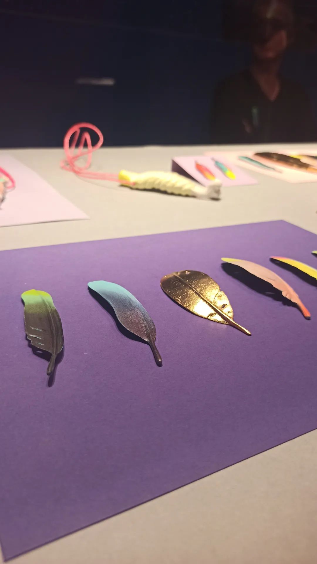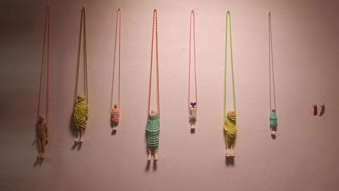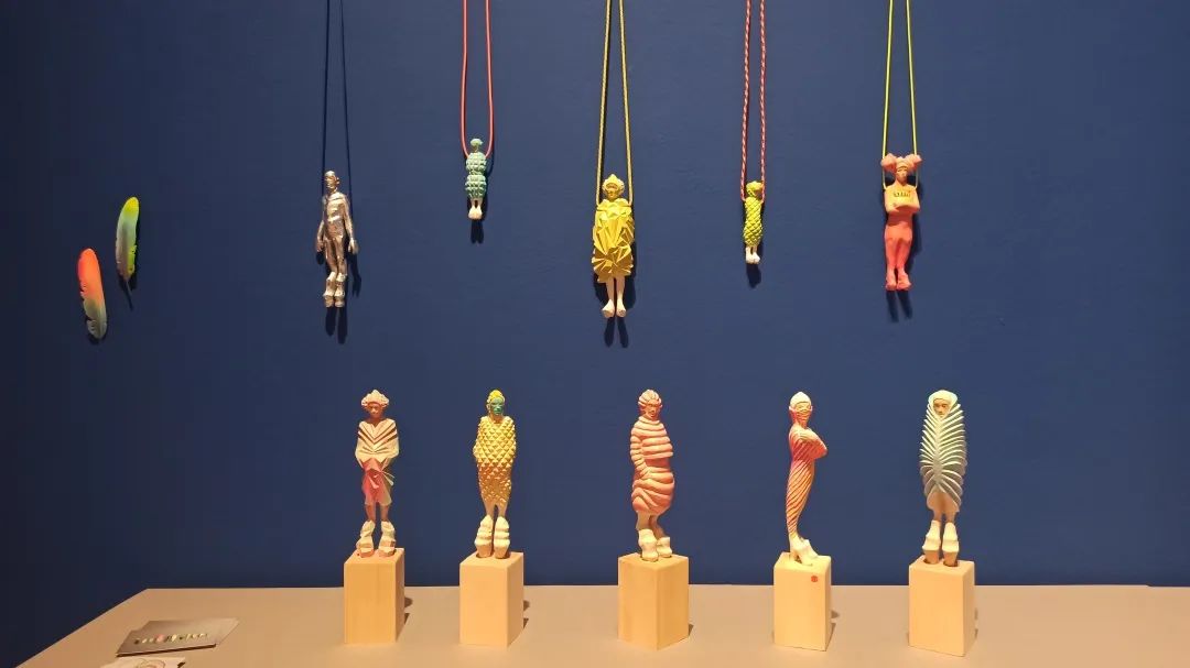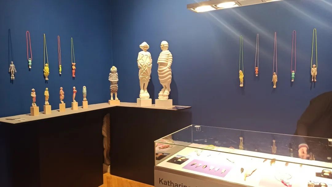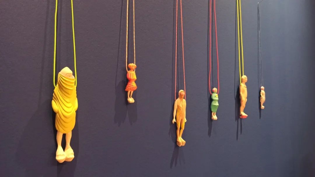 Katharina展位的作品主要分成两部分,它们都是木头制的作品。系列一是人物造型的雕塑及挂坠,系列二是羽毛。