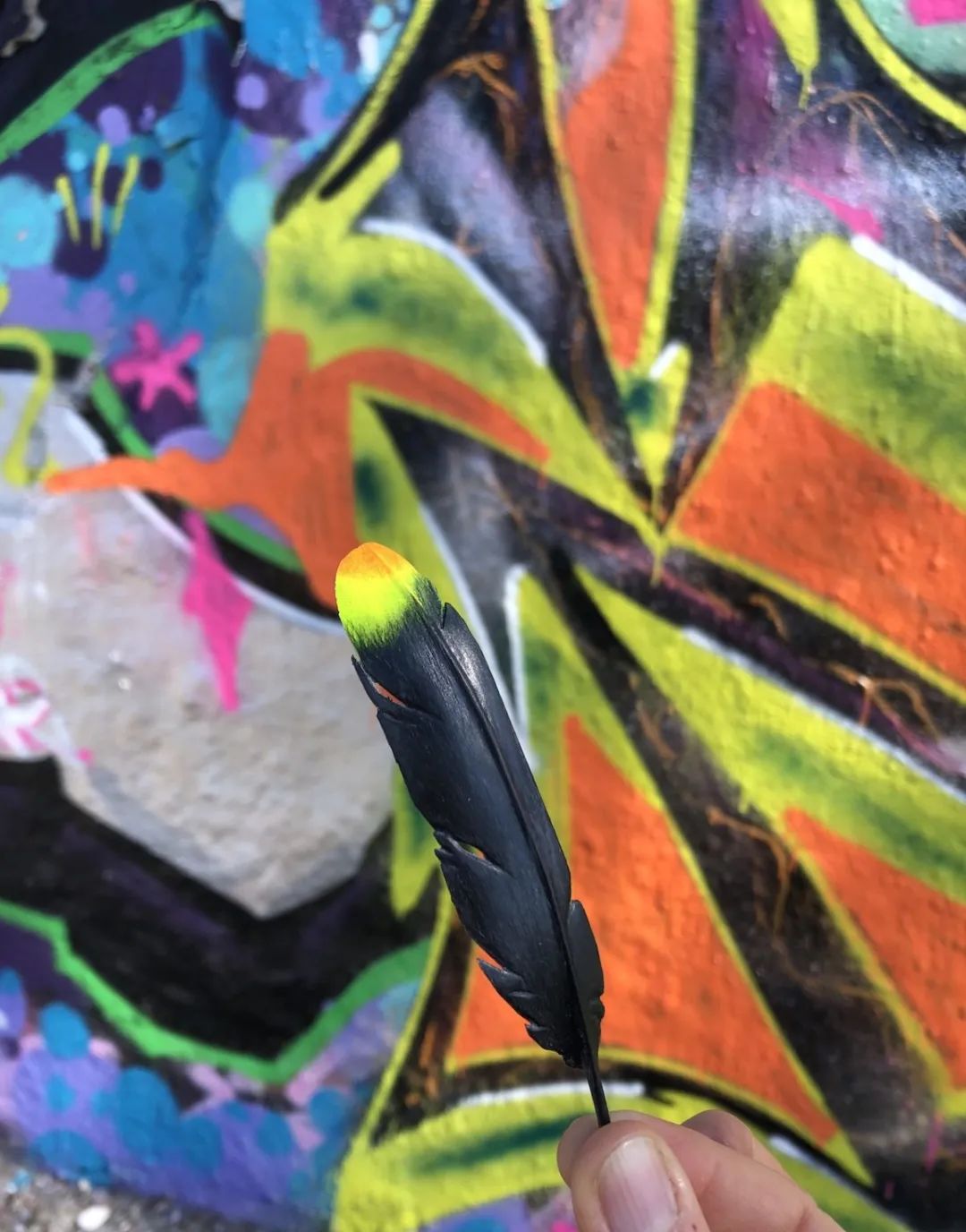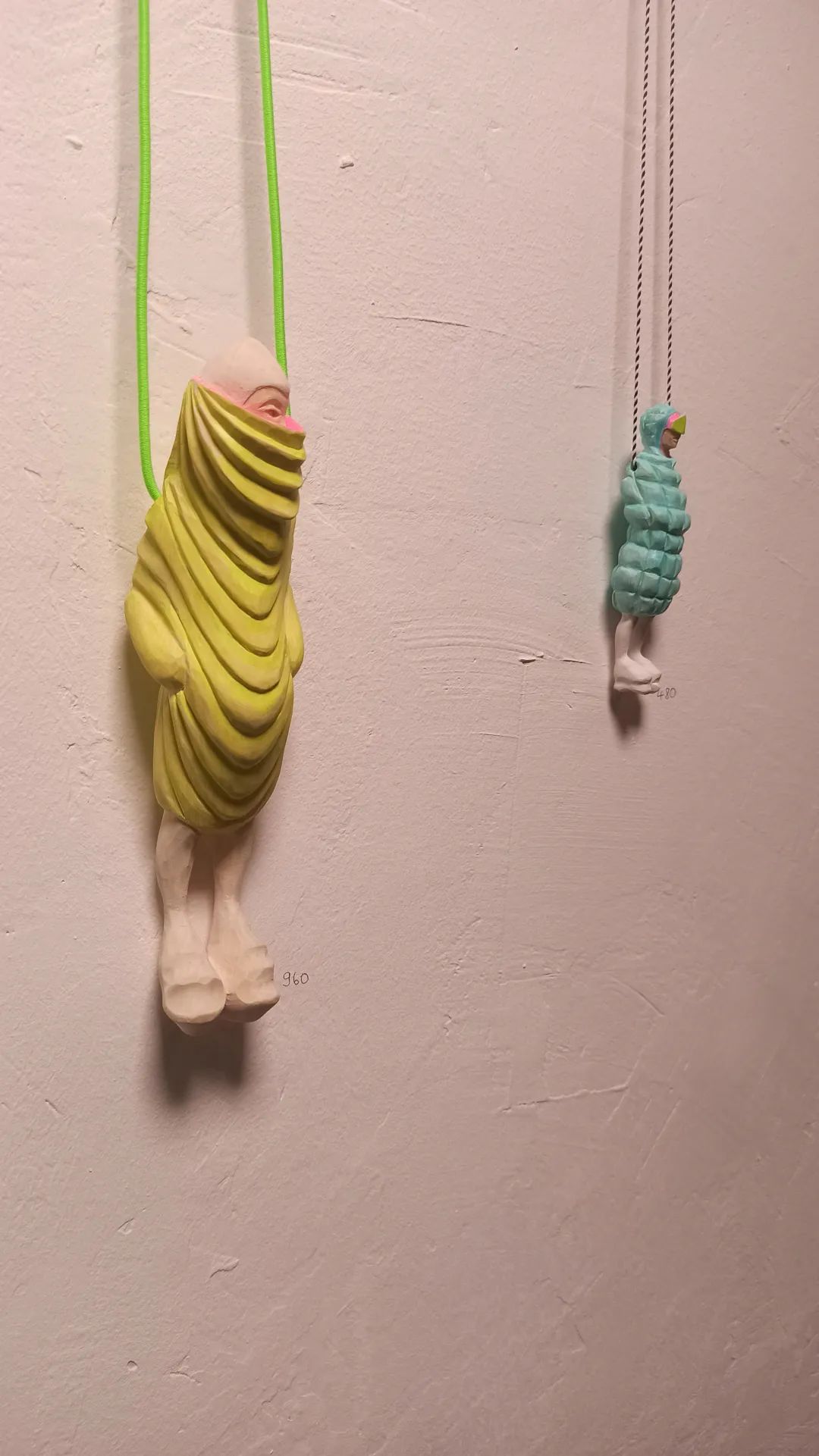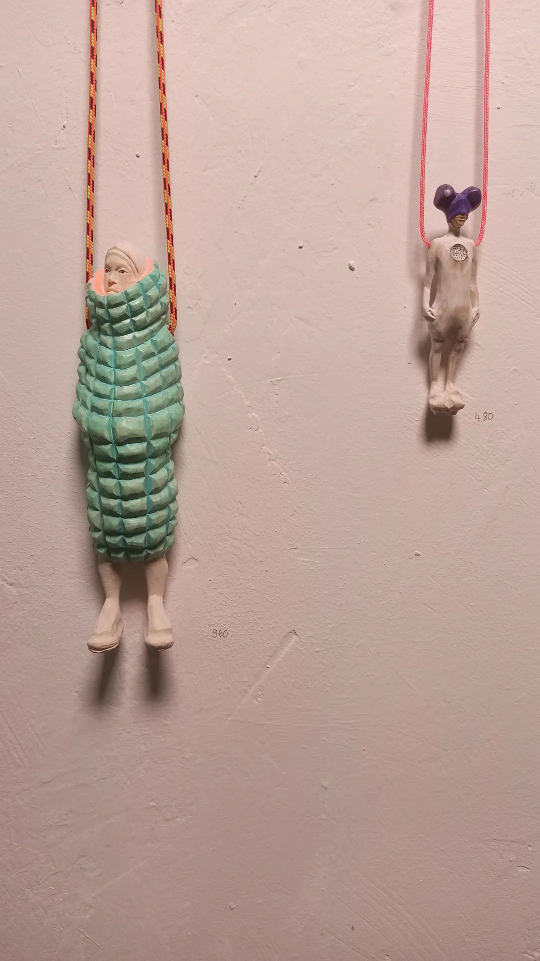 Katharina展位的作品主要分成两部分,它们都是木头制的作品。系列一是人物造型的雕塑及挂坠,系列二是羽毛。