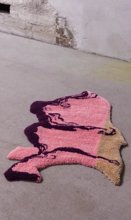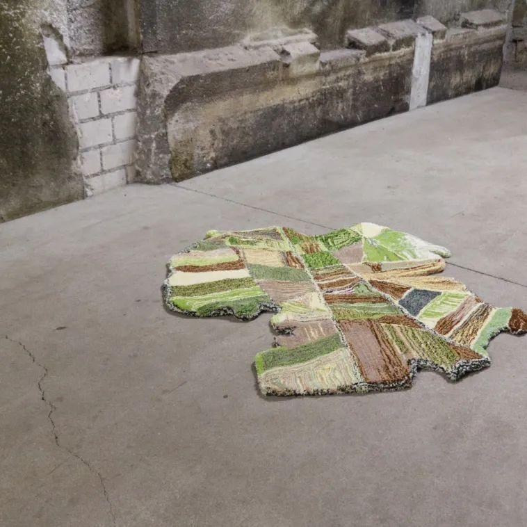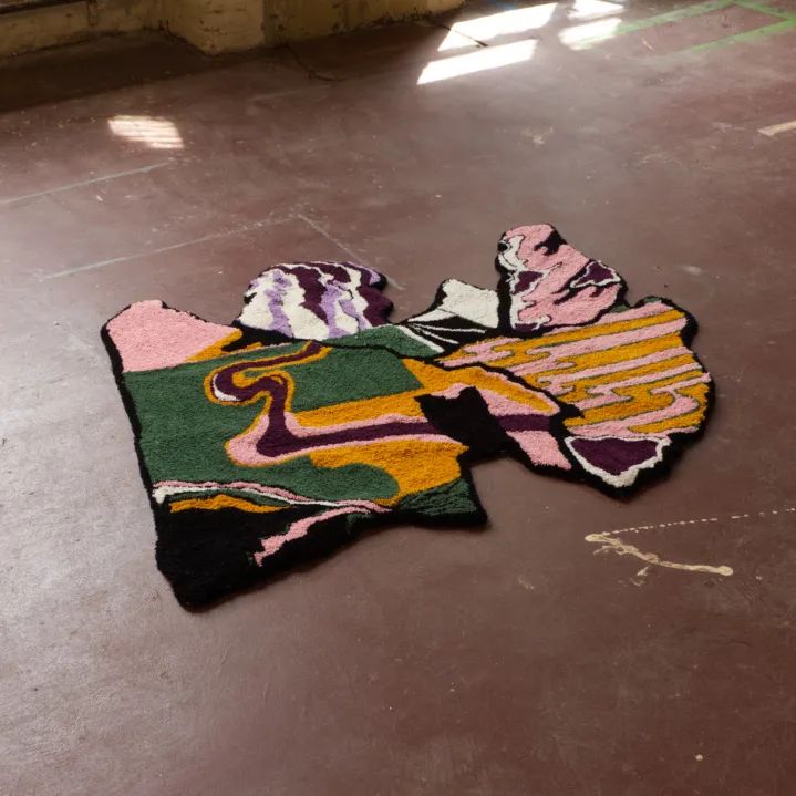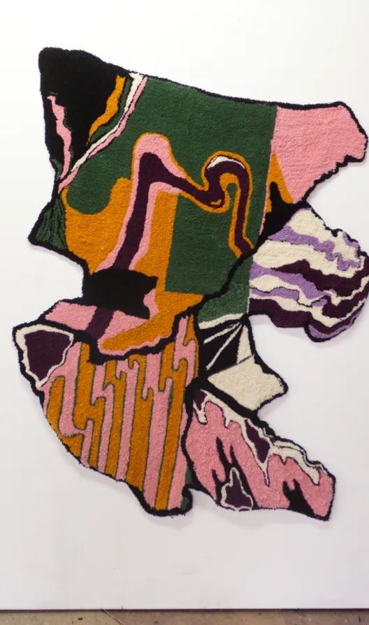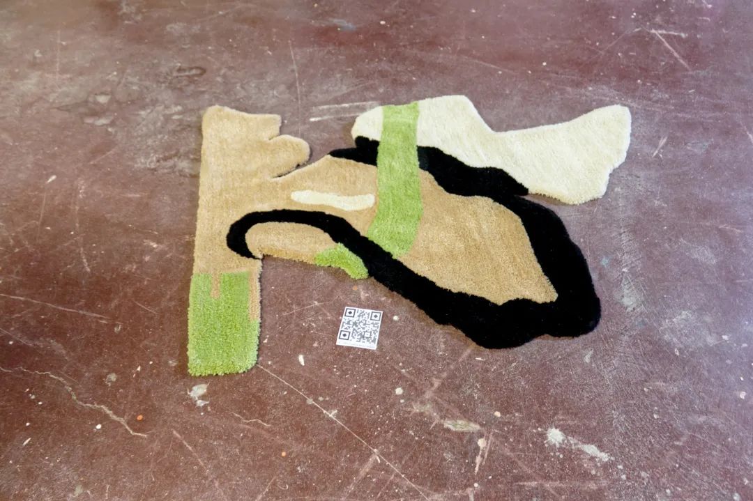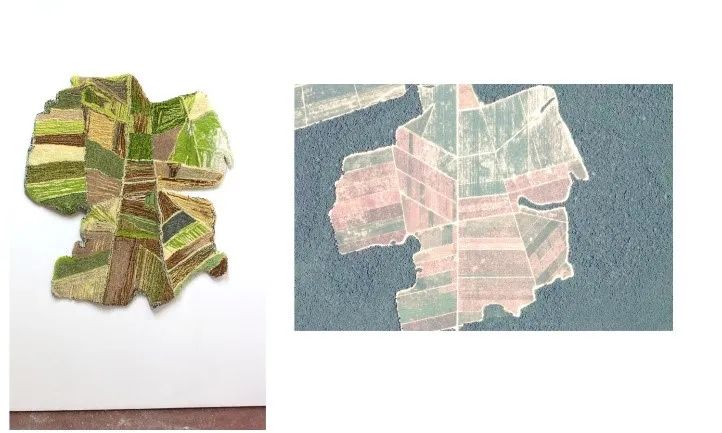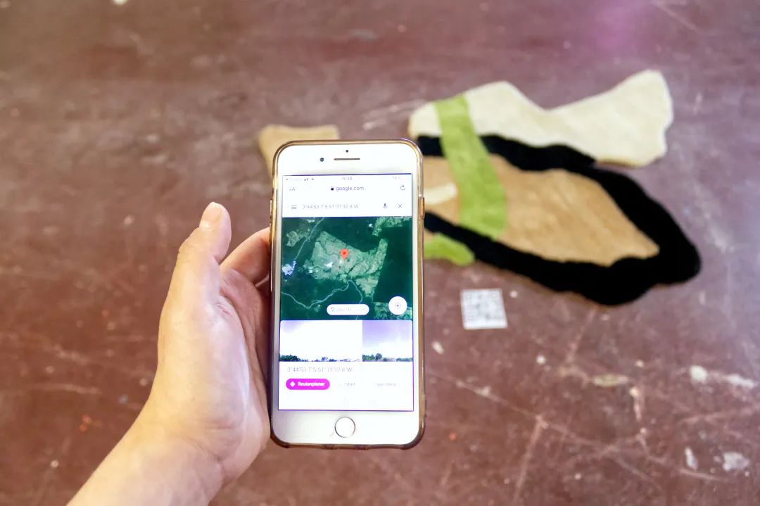 这个项目混合了电子技术和工艺技术,艺术家想要探索的就是残忍的环境破坏后的美丽之处——在破坏来到之前,这些地方原来相貌之美值得被记住,这也是艺术家想要表达的呼吁环保的理念。这些作品的灵感来自于通过谷歌地球卫星图像发现的亚马逊雨林的森林砍伐区,特别是在历史上被标记为原住民领地的土地。Andrea通过tufting这一纺织工艺将谷歌卫星上看到的形状转化为地毯和软雕塑。(tufting,意为簇绒,百度百科:簇绒织物,利用簇绒针将起绒纱穿刺于织物地布上形成的织物。绒纱在地布表面形成均匀密布的绒圈;或用钩刀将绒圈割断在地布表面形成绒头。产品有簇绒地毯及玩具绒布等。)