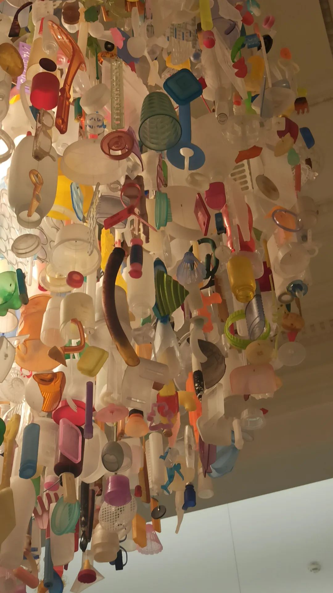 这件艺术创作十分简单明了——用废弃物制作的大吊灯,呼吁的是环境保护的社会问题。不是什么劲爆的创作主题,也没有什么高超的技巧,创作材料更是可以说毫无心意,但是艺术家对于材料体积、颜色的排列和选择使这件原本简简单单的作品充满了视觉冲击力和体积感,灯光和阴影的交错对比绝对吸睛。