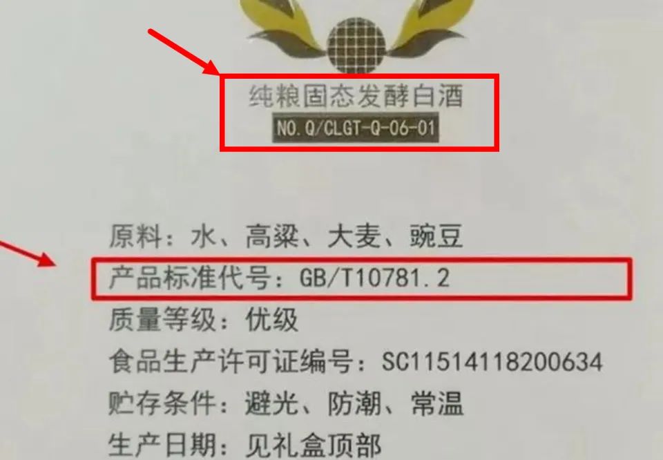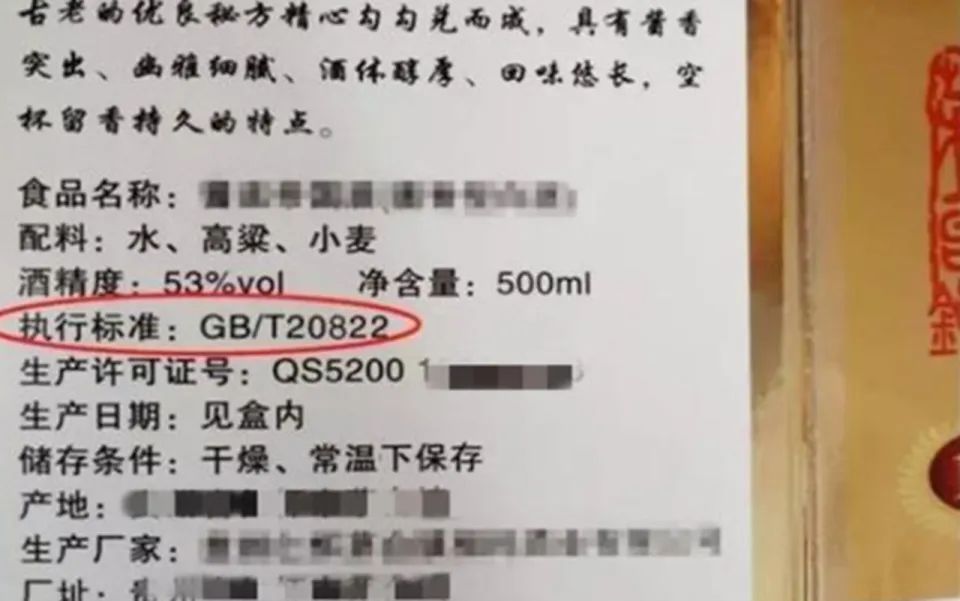 通常来说,以固态法制作的白酒为纯粮酒,而液态法制作的则为酒精酒,因此,在购买酒类时需要明确关注是否标有“固态法制作”,从而避免购买到使用酒精酒糅混或勾兑的白酒。另外也能从配料表中看出一些端倪,纯粮酒的原料只会有粮食和水。而酒精勾兑酒一般还添加了食用酒精或液态法白酒、食用酒精等用料,而酒精酒则是纯粹的食用酒精、食用香精和水进行调配的,也能一目了然。标记 2:看标准号是否“GB/T20821”或“GB/T20822”