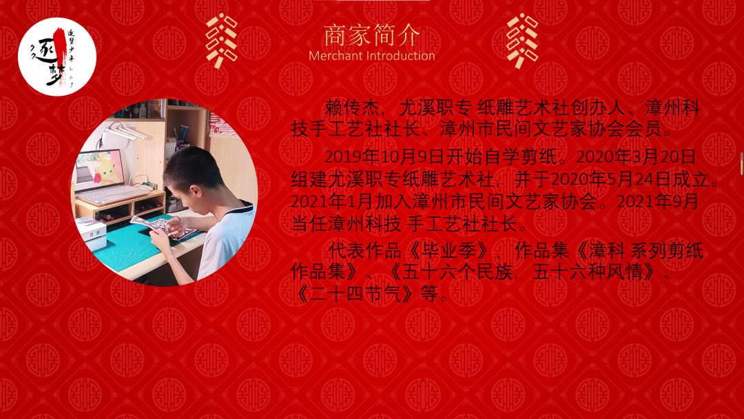 以剪纸为主体,销售剪纸文创(书签、团扇、纸雕灯等),剪纸作品、窗花等。同时还可以现场体验剪纸制作。感受中国非物质文化遗产——剪纸的魅力。