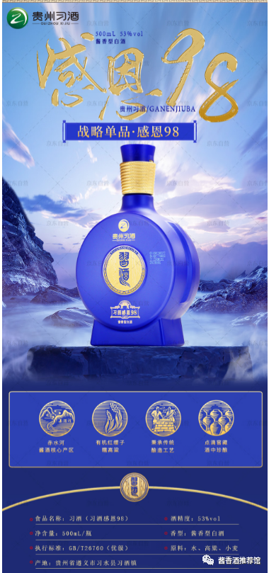 “赤水核心,甄选红粮,传承古法,岁月窖藏”,习酒感恩98以本地优质糯高粱、小麦、水为原料,经两次投料、九次蒸煮、八次加曲发酵、七次取酒,通过高温制曲、堆积、发酵、流酒和长期贮存的特殊工艺精制而成,是能够满足大众消费的高品质、高性价比的产品。
