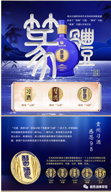 在产品设计上,习酒感恩98采用了寓意圆润和谐的圆牌,表示团圆和意在合家欢乐。圆牌中围上一圈麦穗,讲述着习酒感恩98是经由甄选红粮、纯粮酿造而成;圆牌中的浪花图案不仅代表着赤水核心,也寓意着满满酒花的酱酒醇香。