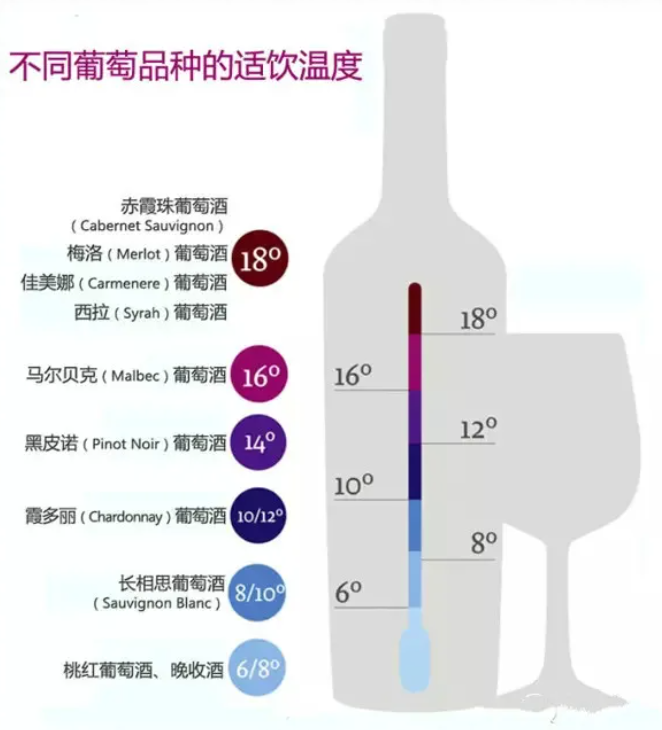 一般来说,喝红葡萄酒时,温度最好在 16~18℃ 之间;白葡萄酒在 10~12℃ 之间;起泡葡萄酒比较适宜的温度则在 6~10℃ 之间,当然,不同品种的葡萄酒之间可能存在差异,但总体来说,侍酒温度不会低于冰镇啤酒,也往往比室温低。