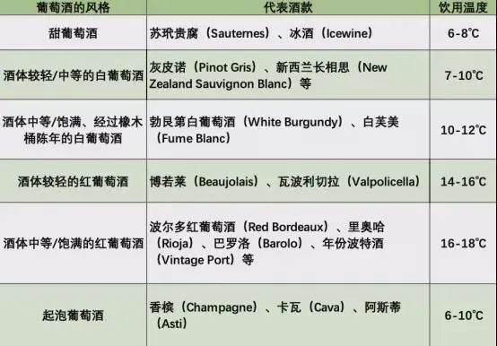 酒体厚重的红葡萄酒的侍酒温度一般为16~18℃,酒体偏轻的白葡萄酒的侍酒温度往往为10~12℃,而酒体厚重感介于红白葡萄酒之间的桃红葡萄酒,侍酒温度则介于两者之间,一般在12~14℃。